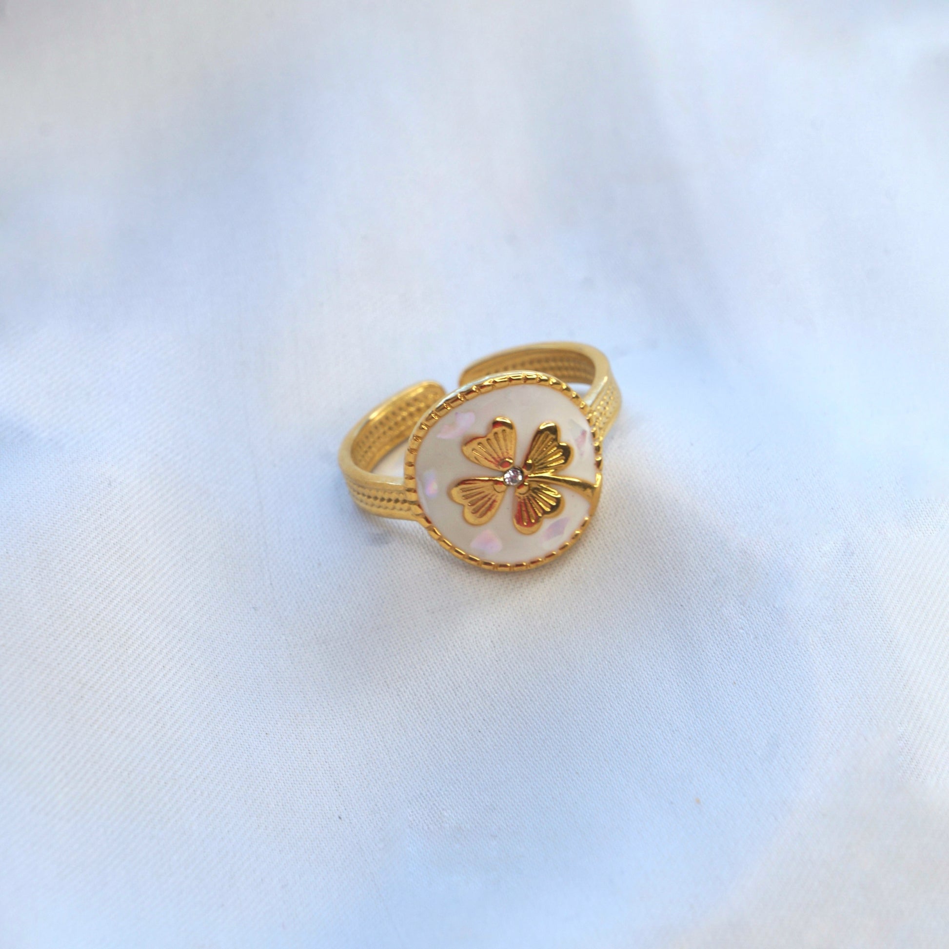 La bague Gaïa est l'accessoire indispensable pour toute femme élégante et sophistiquée. Faite en acier inoxydable doré de haute qualité, elle est ornée d'un motif central en forme de trèfle avec des détails dorés délicats. Ajoutez une touche de charme et de classe à toutes vos tenues avec cette bague Gaïa.