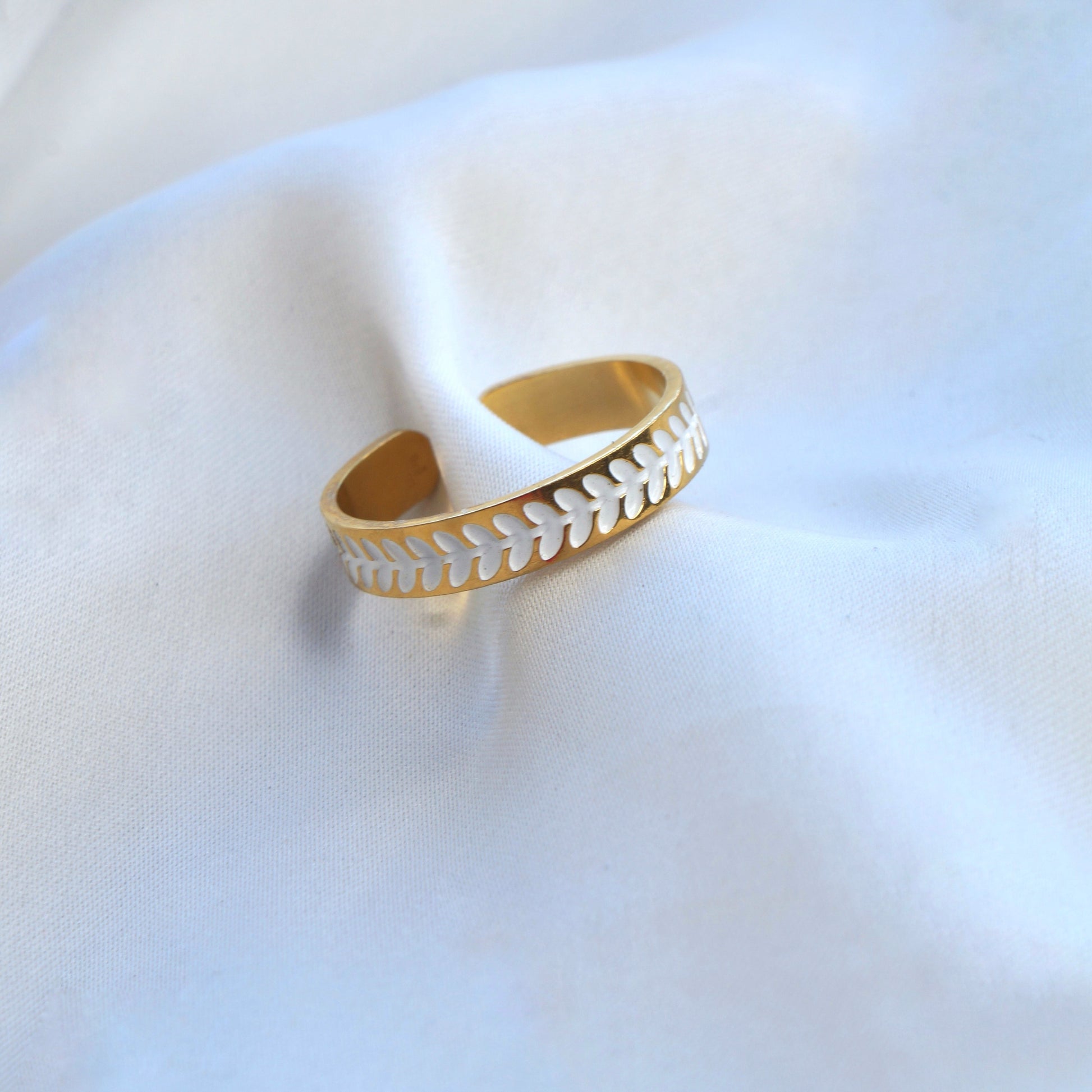 Succombez au charme envoûtant de la Bague Hestia. Confectionnée avec de l'acier inoxydable doré, cette bague élégante arbore une tresse blanche délicate qui l'enveloppe tout autour. Ajoutez une touche de sophistication à votre tenue avec cette pièce exclusive et profitez de sa durabilité supérieure.
