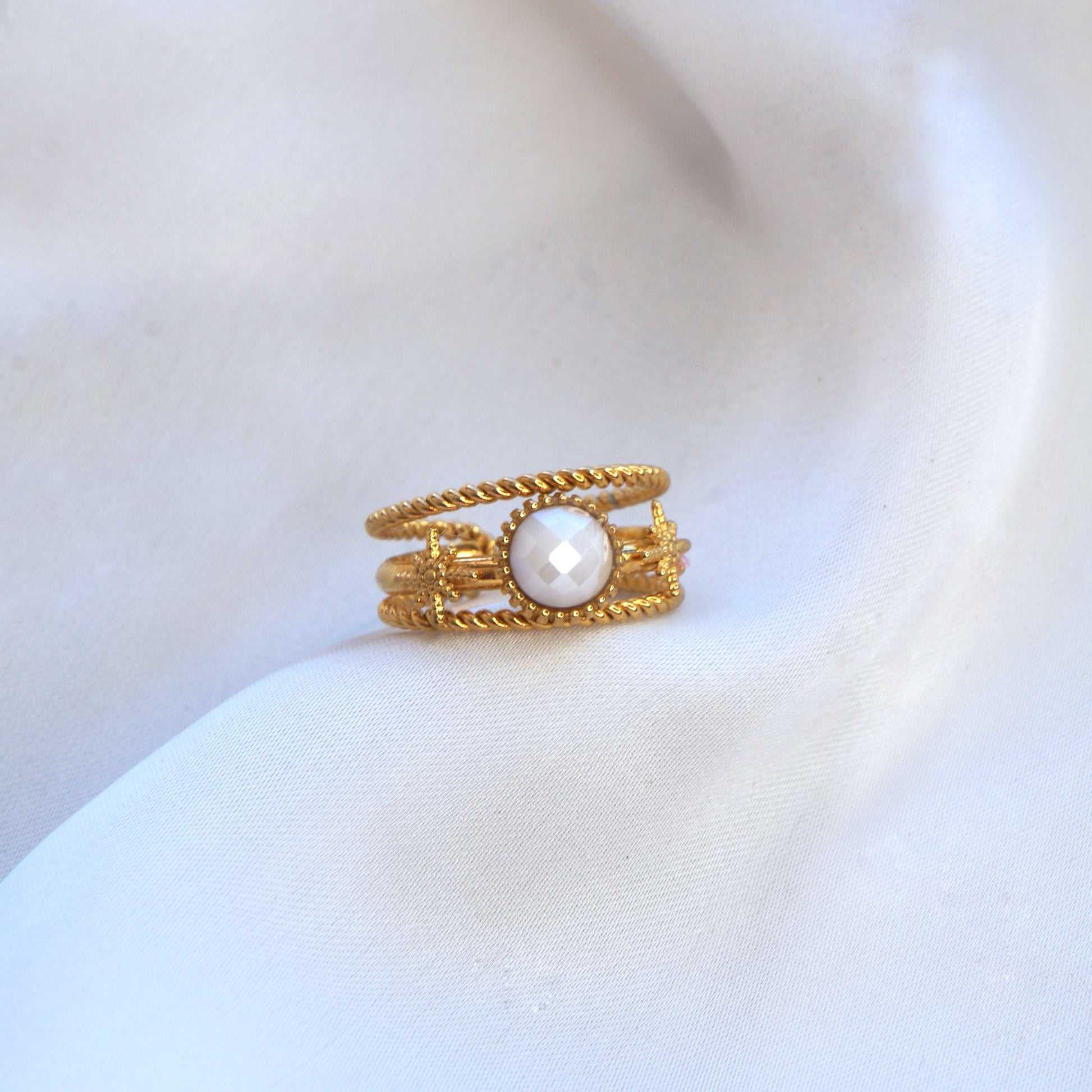 Un bijou de haute qualité, cette bague en acier inoxydable doré est orné d'une pierre blanche centrale qui ajoute une touche d'élégance et de sophistication. Ajoutez une touche de luxe à votre tenue avec la bague Eury.