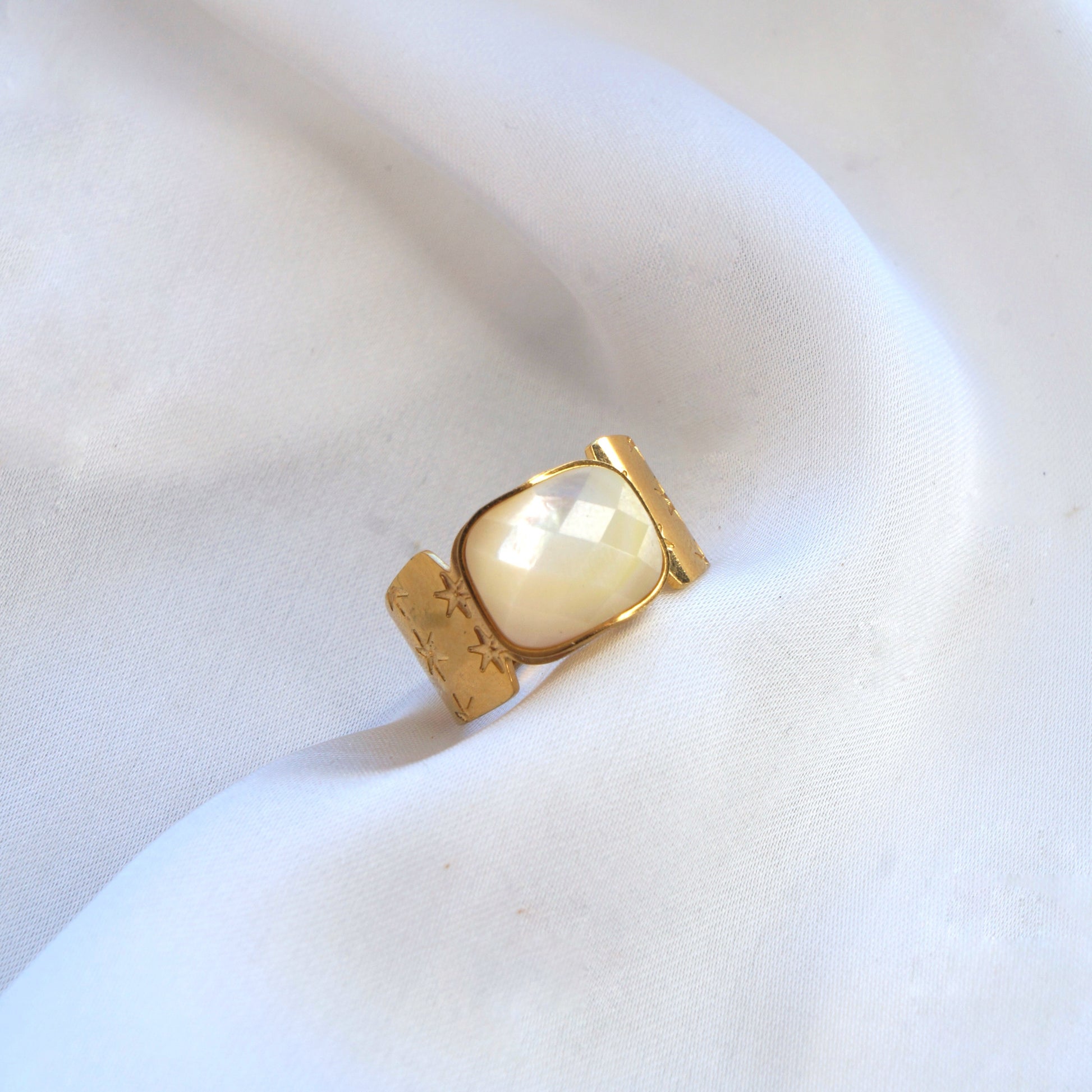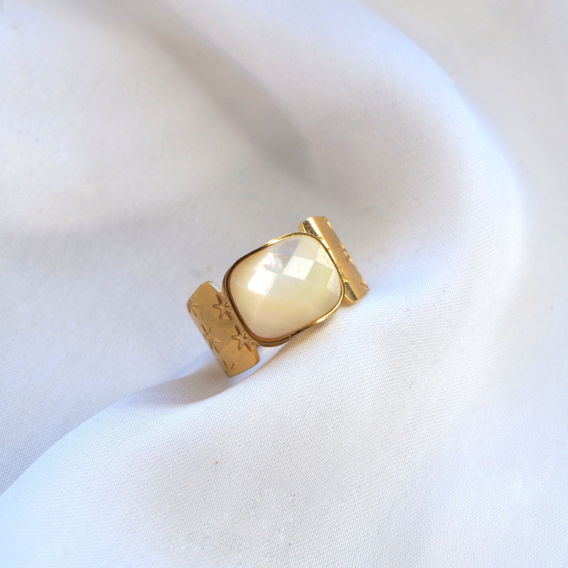 Cette bague Médée en acier inoxydable doré est un véritable bijou de luxe. Elle est ornée d'une superbe pierre rectangulaire blanche au centre, ajoutant une touche d'élégance à votre tenue. Fabriquée avec des matériaux de haute qualité, cette bague est à la fois durable et raffinée, parfaitement adaptée aux occasions spéciales. Faites-vous plaisir avec cette pièce exclusive et unique en son genre.