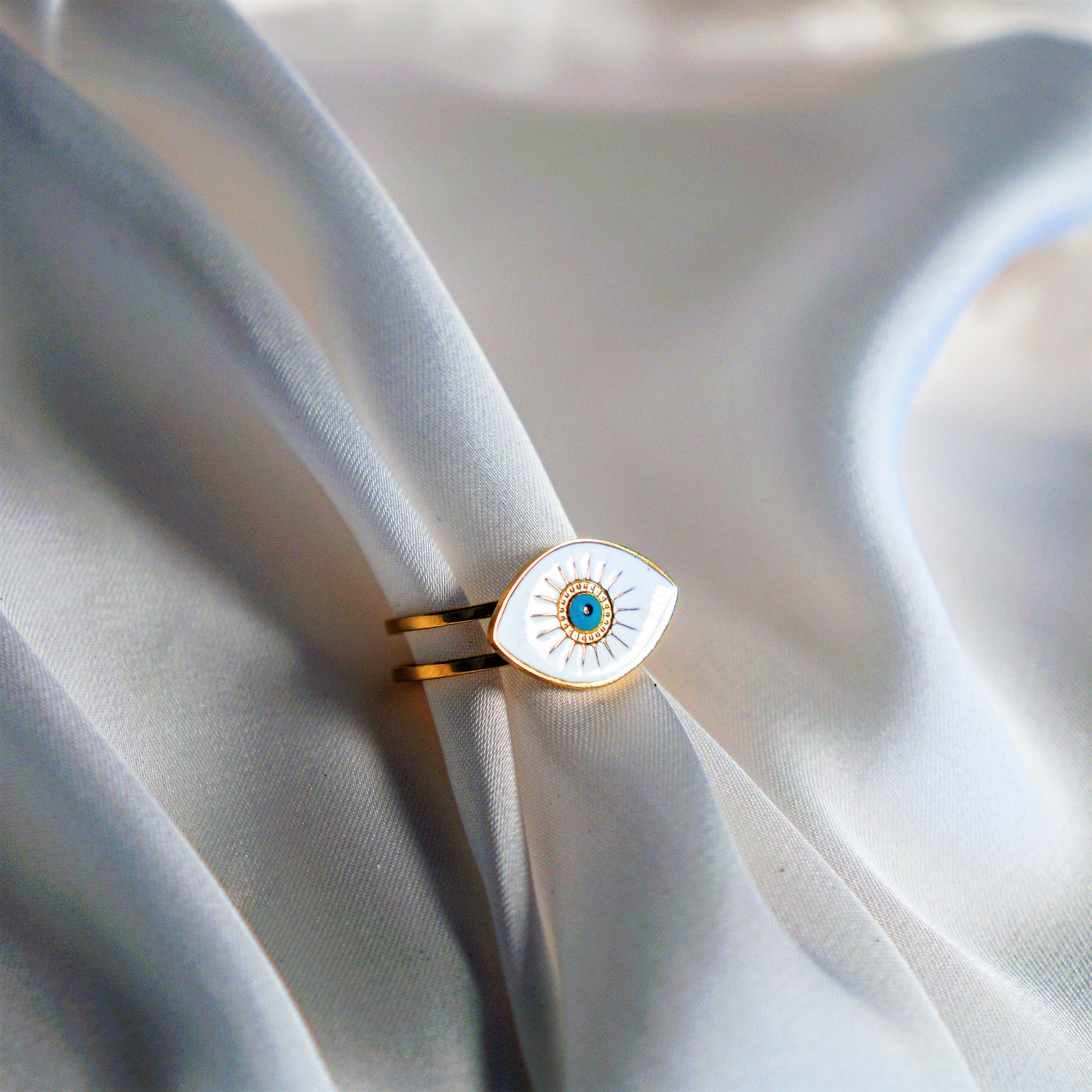Cette bague en acier inoxydable doré est réglable pour s'adapter à différentes tailles de doigts. Son motif central représente un charmant oeil grec blanc et turquoise en forme de ballon de rugby, parfait pour ajouter une touche de couleur à votre tenue estivale. La bague est légère et confortable à porter tout en étant résistante à l'usure et durable. Le design est simple et élégant, avec des finitions soignées qui ajoutent une touche de sophistication à l'ensemble.