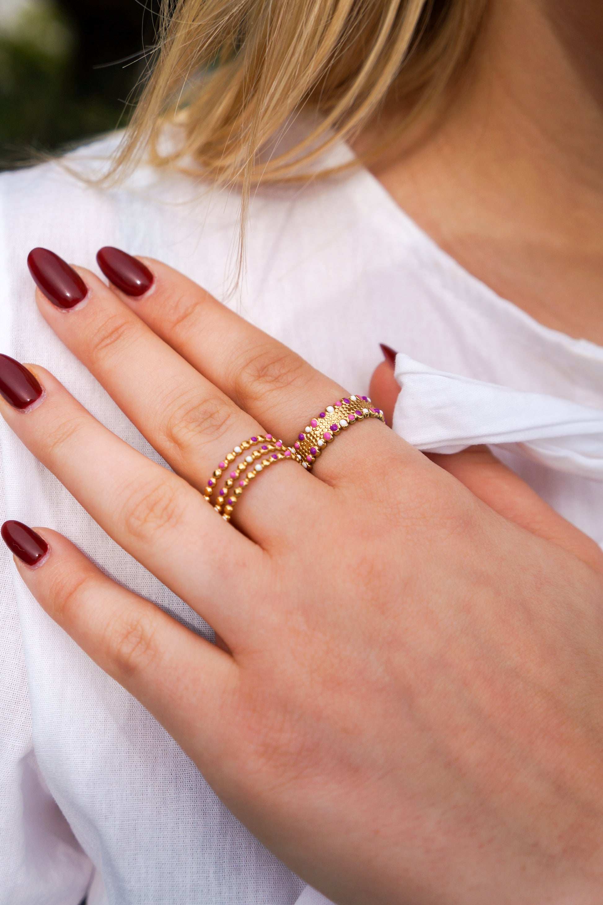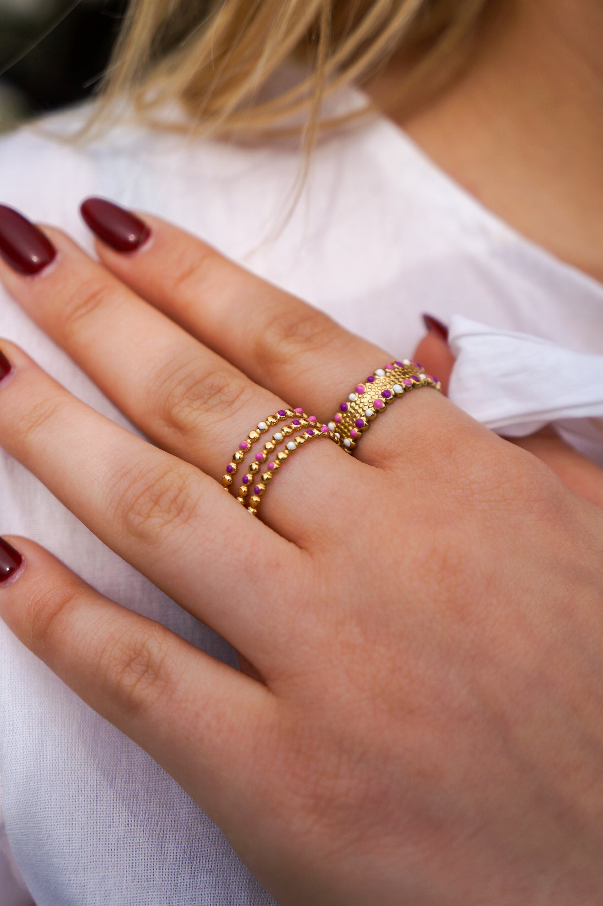 Ajoutez une touche sophistiquée à votre tenue avec la Bague Lena. Fabriquée en acier inoxydable doré, cette bague trois rangs comprend des détails en violet et rose pour un look élégant et exclusif. Parfait pour compléter n'importe quelle tenue, cette bague est un must-have pour toute collection de bijoux.