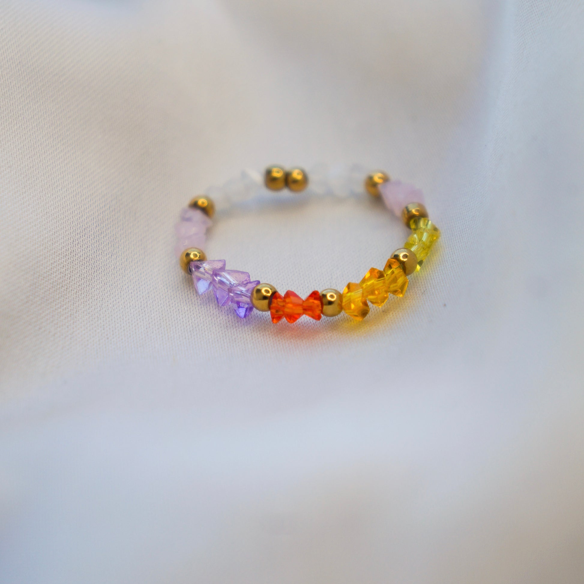 Cette bague en élastique Myrtle est la touche finale parfaite pour compléter votre tenue. Fabriquée en acier inoxydable doré, elle est ornée de perles multicolores. Sa qualité supérieure et son design élégant en font un accessoire de mode incontournable pour les amateurs de bijoux de luxe.