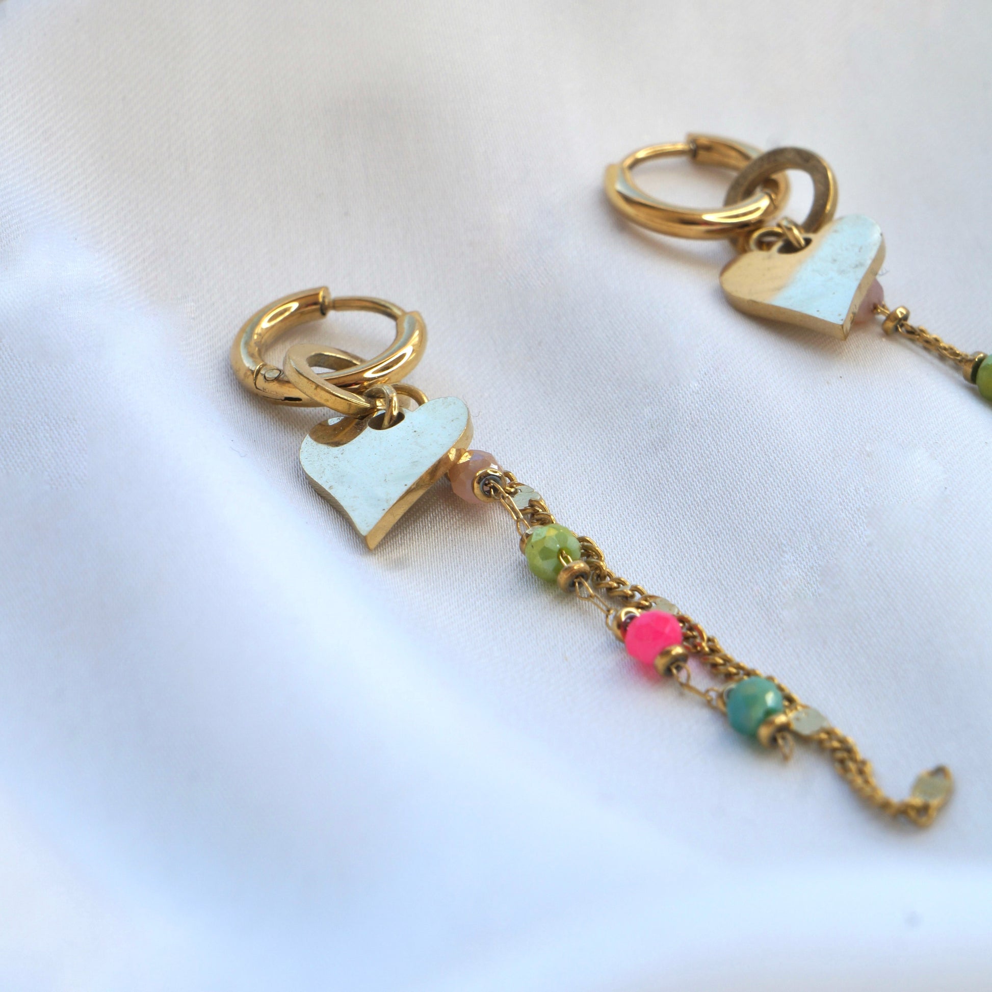 Ces Boucles d'Oreilles Léda sont un bijou raffiné et original. Les jolies perles colorées et le coeur en acier inoxydable doré ajoutent une touche de sophistication à votre tenue. Leur design pendante est un choix élégant pour toute occasion. Ajoutez une touche de luxe à votre style avec ces boucles d'oreilles exclusives.