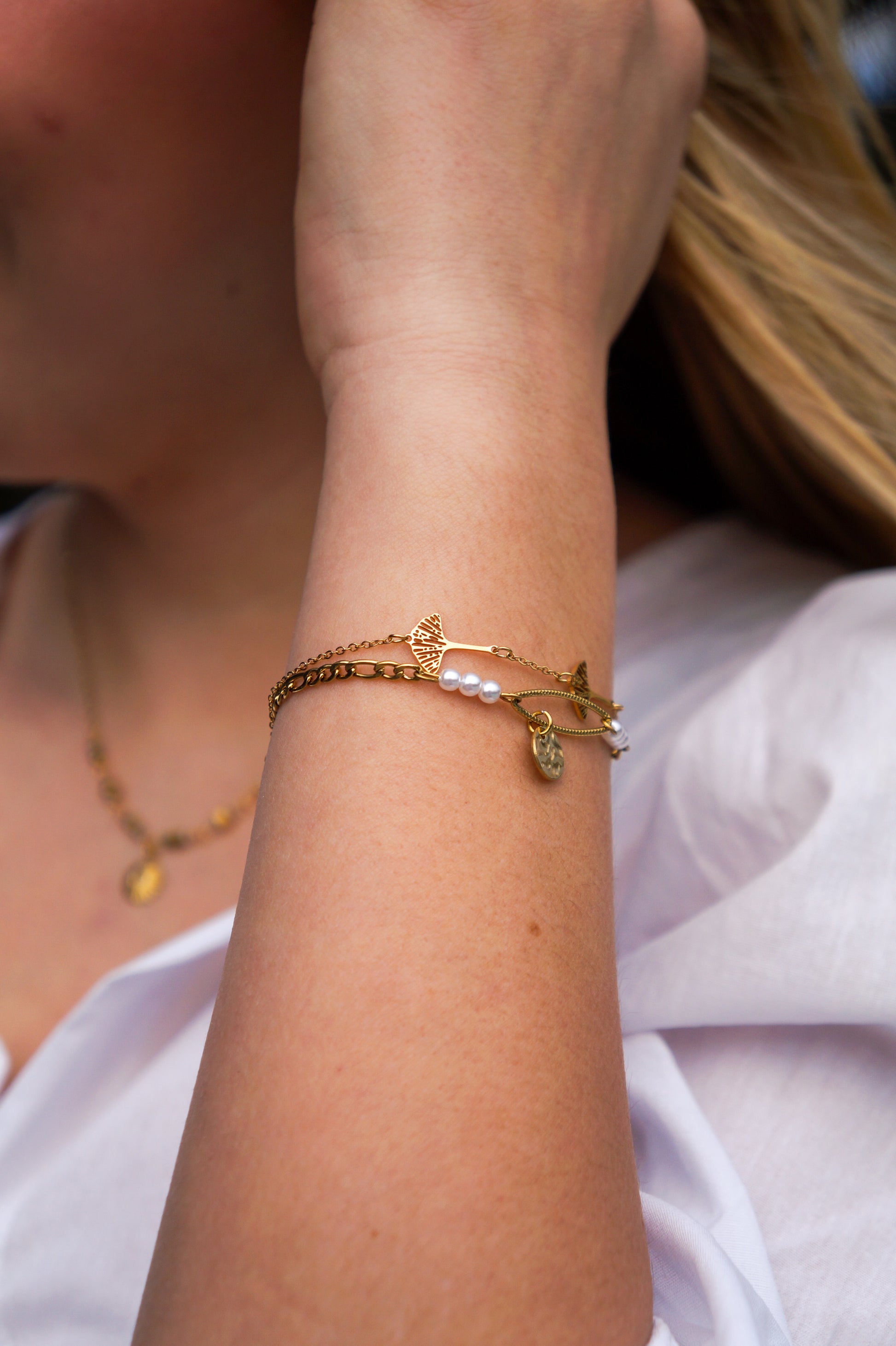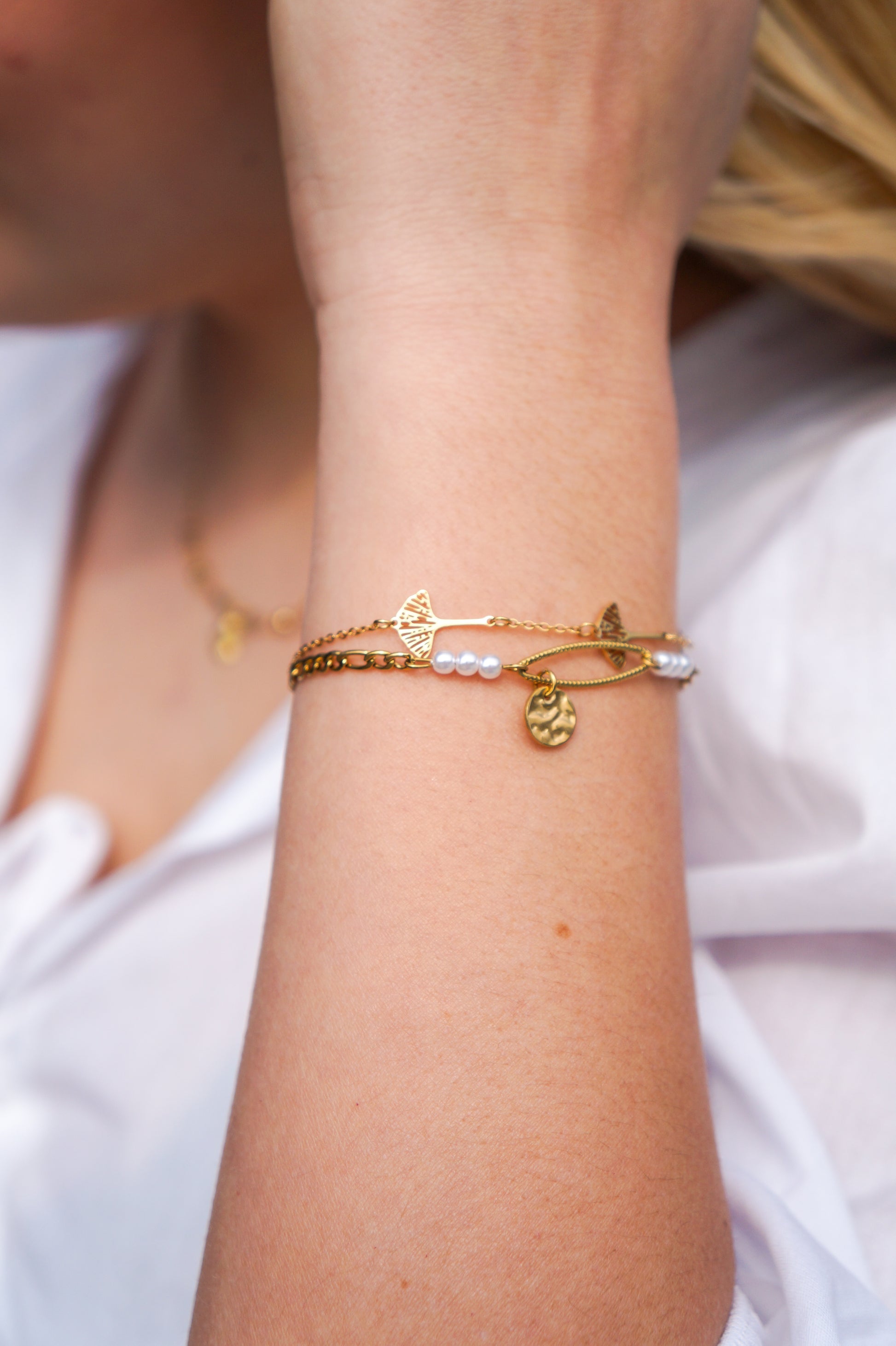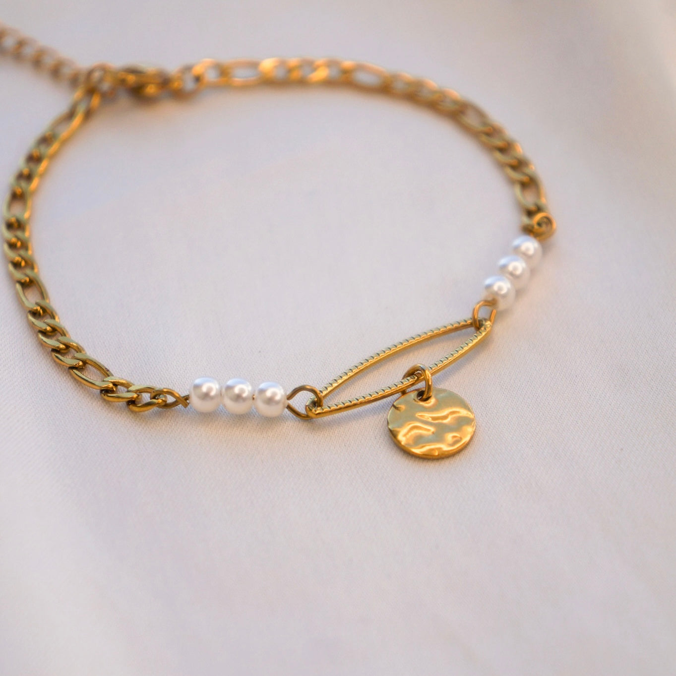 Découvrez le Bracelet Eve, un bijou élégant et exclusif en acier inoxydable doré. Cette pièce de haute qualité comporte une perle d'eau douce d'imitation et une pastille dorée martelée, représentant la sophistication et l'art. Ajoutez une touche de luxe à votre look avec le Bracelet Eve.