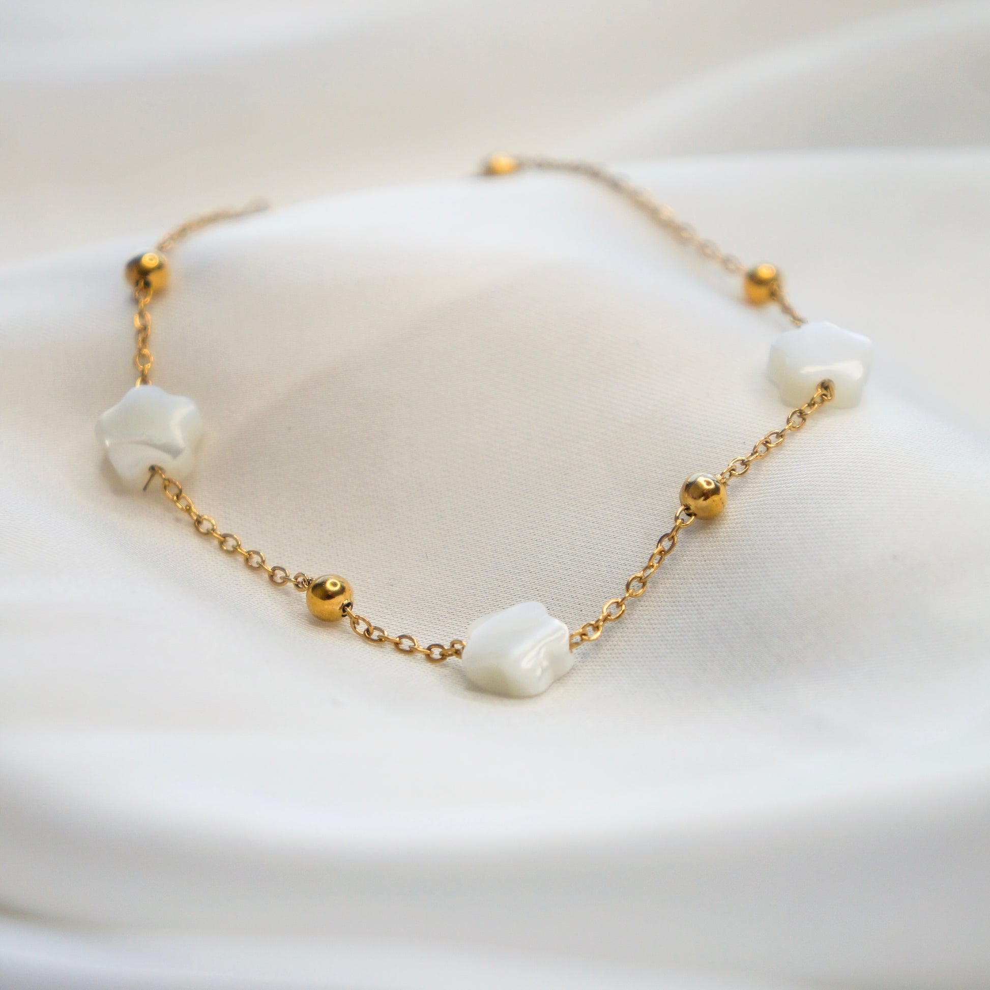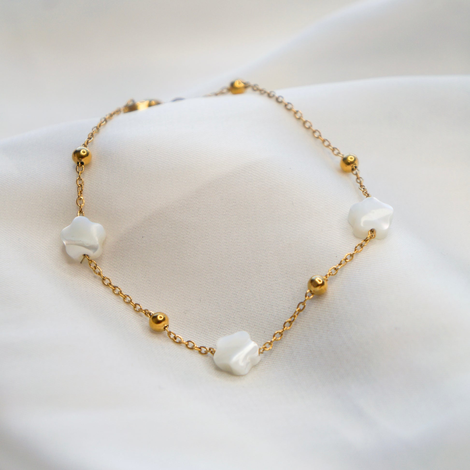 "Parfait pour ajouter une touche de glamour à votre tenue. Le bracelet Pollen en acier inoxydable doré est orné de 3 pierres en forme de fleur, apportant une touche de délicatesse et de sophistication. Un accessoire incontournable pour les amoureux de la mode et de l'élégance."
