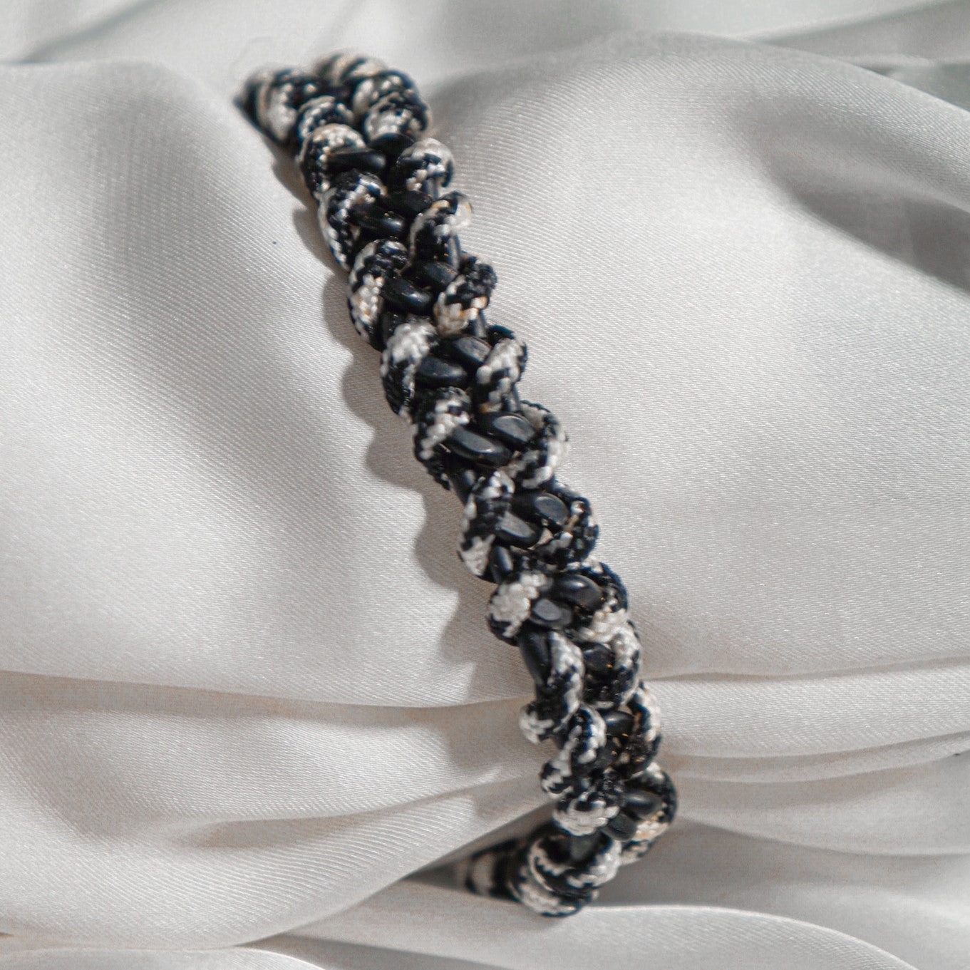 Le bracelet est également doté d'un tissu avec un motif gris qui apporte une touche de contraste et d'élégance. Le motif gris ajoute une subtile touche de sophistication, s'harmonisant parfaitement avec la chaînette torsadée en acier noir. Le tissu offre une douceur agréable au contact de la peau, offrant un confort optimal tout au long de la journée.