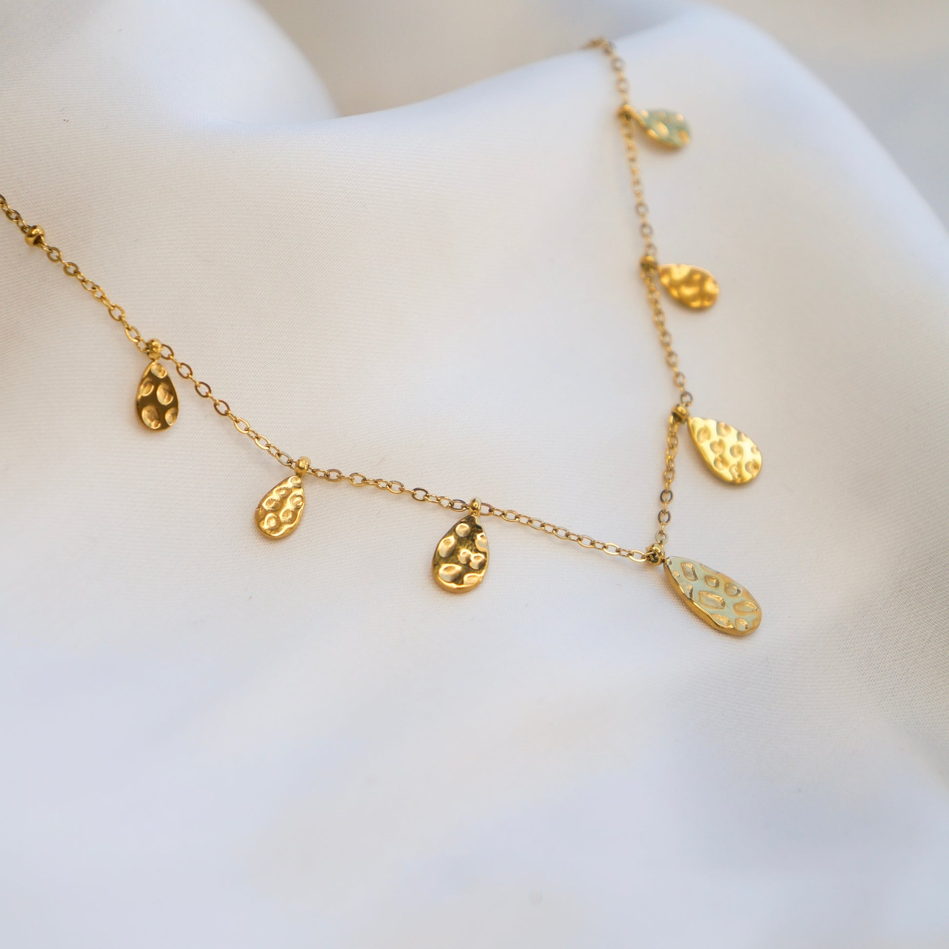 Transformez votre look en un style plus élégant avec notre Collier Amina. Fabriqué en acier inoxydable doré, ce collier dispose d'un motif unique composé de gouttes d'eau martelées, ajoutant une touche artistique et exclusive à votre tenue. Faites-vous remarquer avec ce collier sophistiqué et tendance.