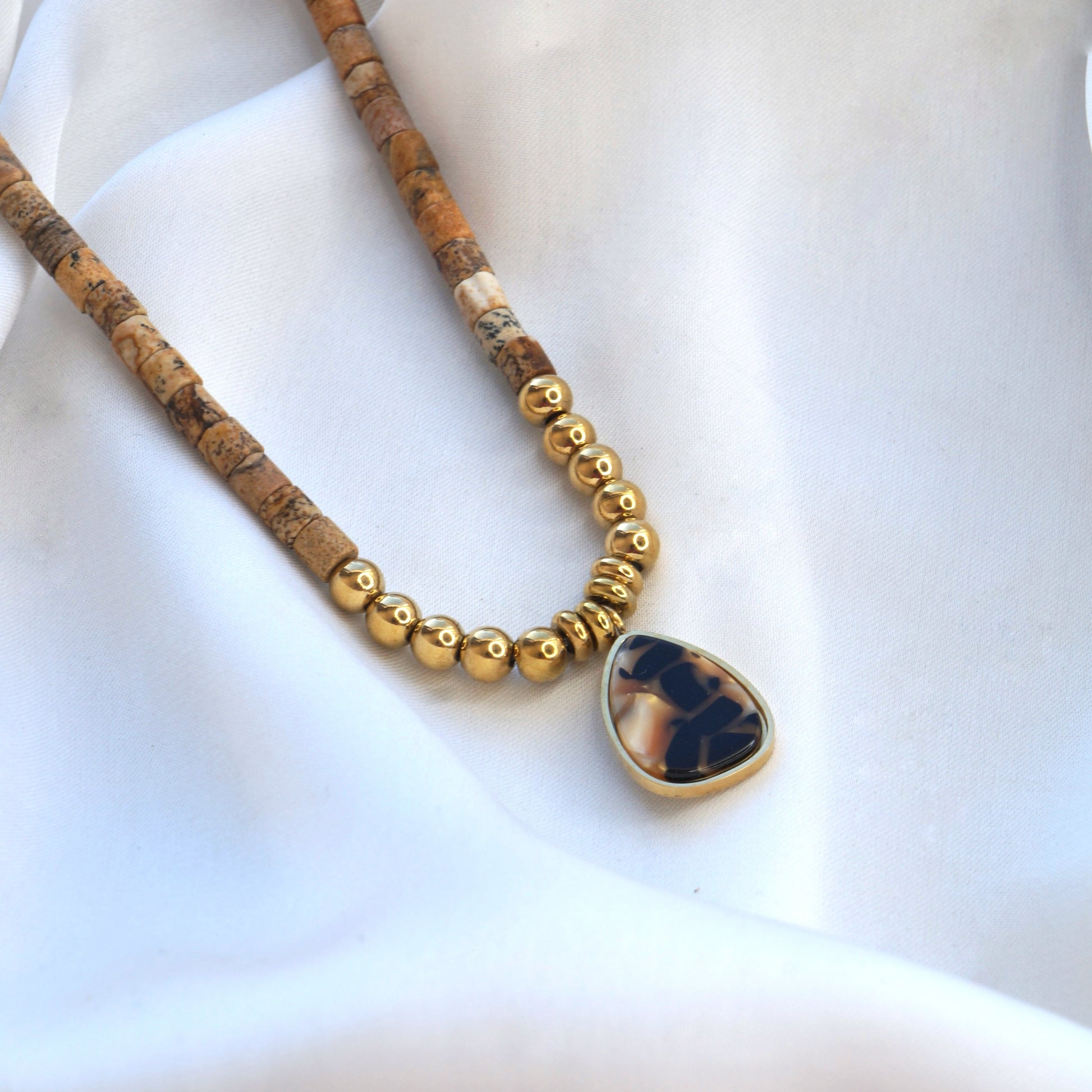 Le Collier Briséis en acier inoxydable doré est l'accessoire parfait pour mettre en valeur votre élégance et votre style. Avec sa pierre d'imitation au motif léopard et ses pierres naturelles scintillantes, il offre une touche sophistiquée et exclusive à toutes vos tenues. Un must-have pour toute fashionista passionnée d'art et de littérature.