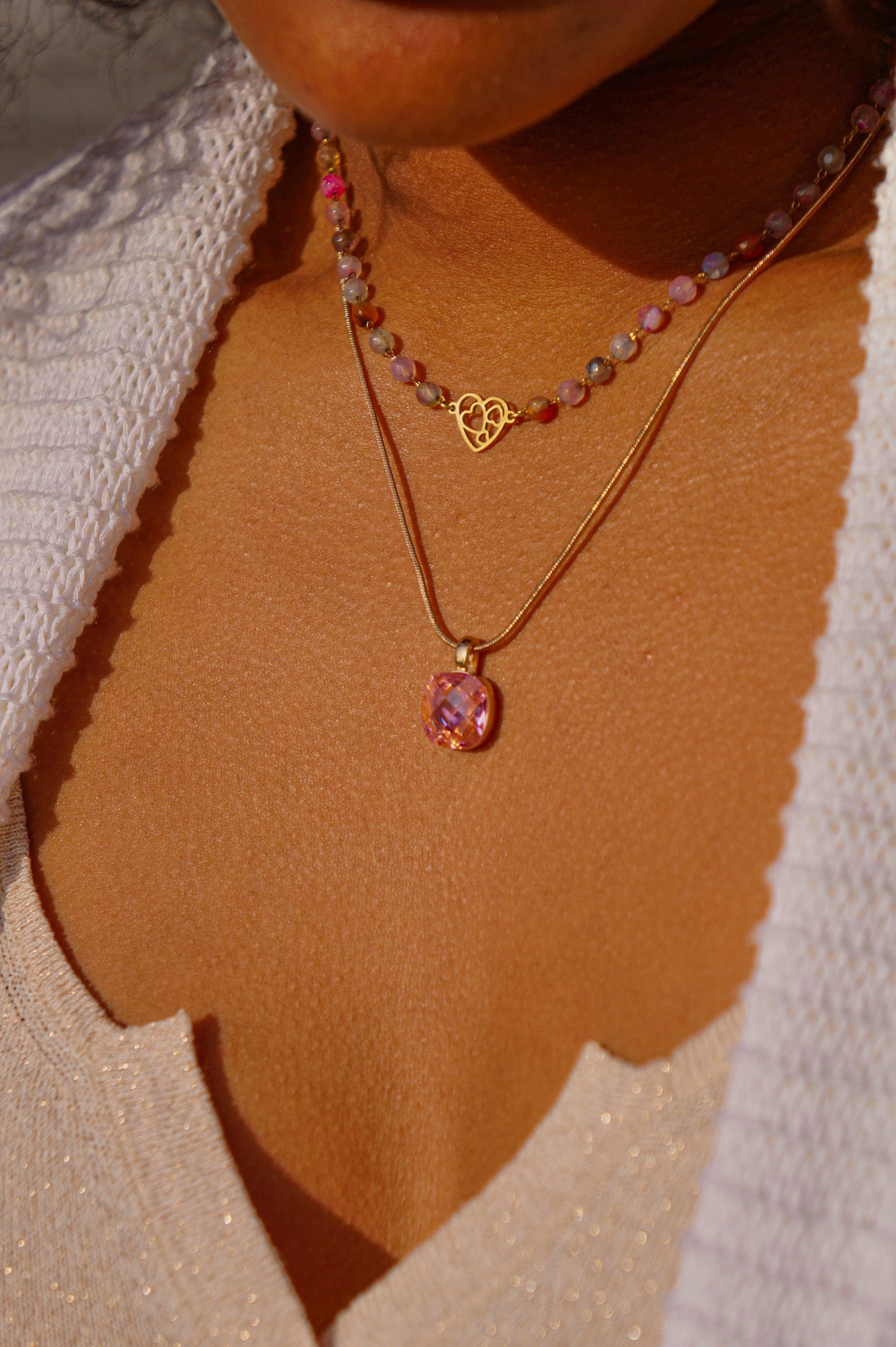 Le pendentif en forme de cœur travaillé doré est le point focal de ce collier. Il est conçu avec une grande attention aux détails et est orné de motifs délicats qui ajoutent une touche d'élégance supplémentaire au bijou. Le cœur doré apporte une touche de brillance supplémentaire, faisant ressortir les pierres roses et ajoutant une touche de sophistication à l'ensemble.