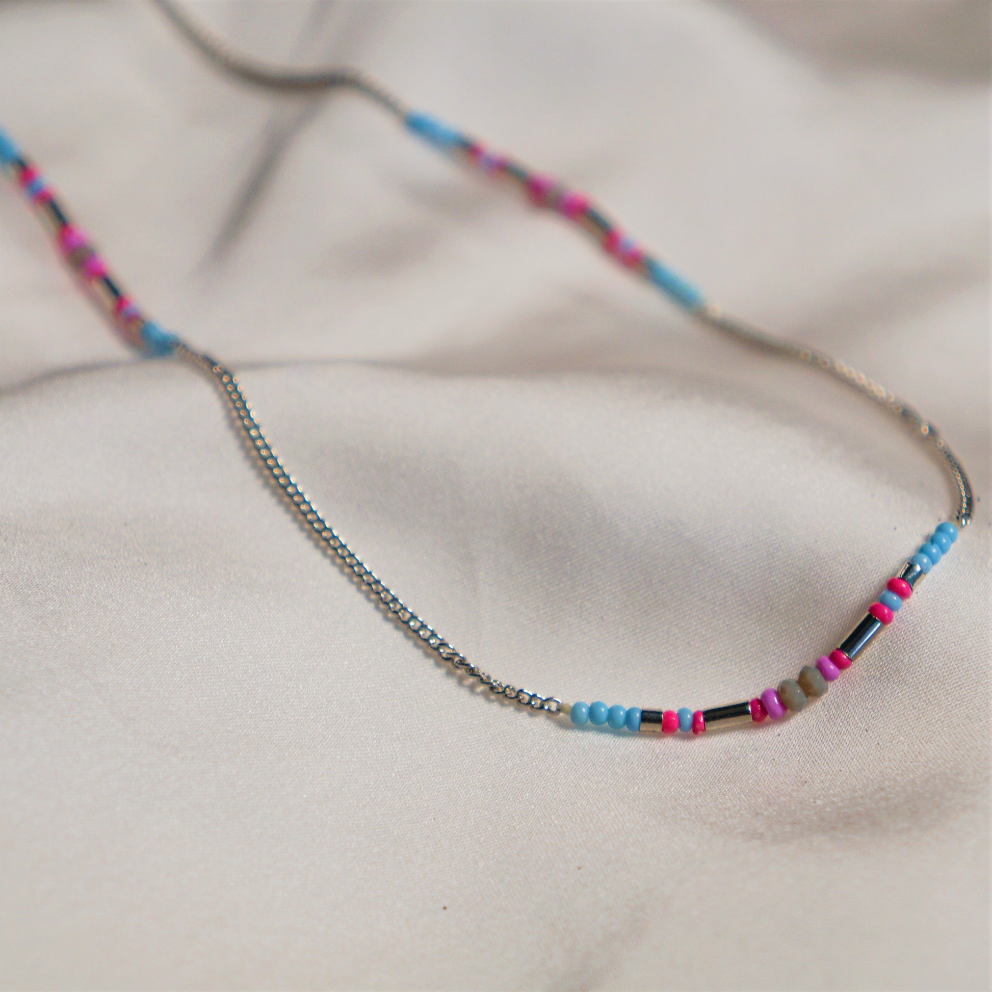 Ce collier en acier inoxydable argenté fin avec des petites perles de couleurs bleutées et rosées est une pièce absolument charmante et raffinée. Les perles délicates et élégantes disposées ponctuellement sur la chaîne créent un effet subtil et sophistiqué qui ajoute une touche de grâce à l'ensemble.