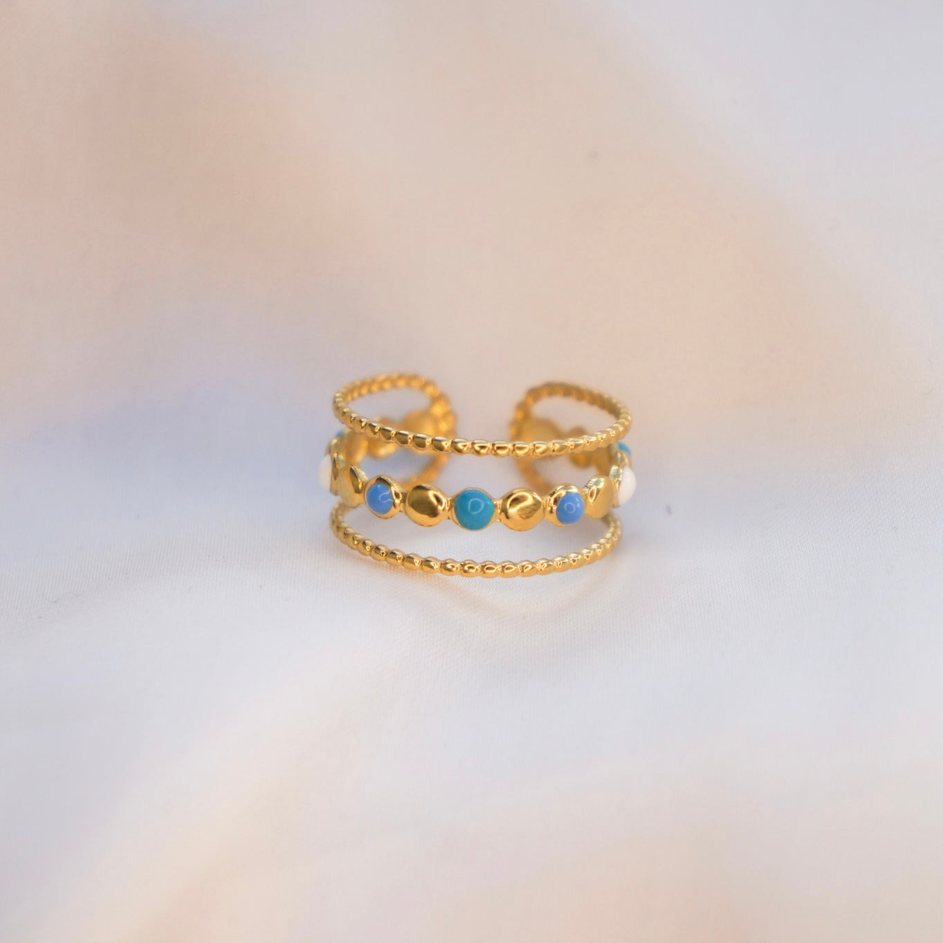 Découvrez la sophistication et l'exclusivité de la Bague Penny. Fabriquée en acier inoxydable, elle offre une résistance durable. Son design élégant comprend trois rangées d'or avec des détails en bleu et blanc, évoquant le monde de l'art et de la mode. Ajoutez une touche de luxe à votre look avec cette bague unique.