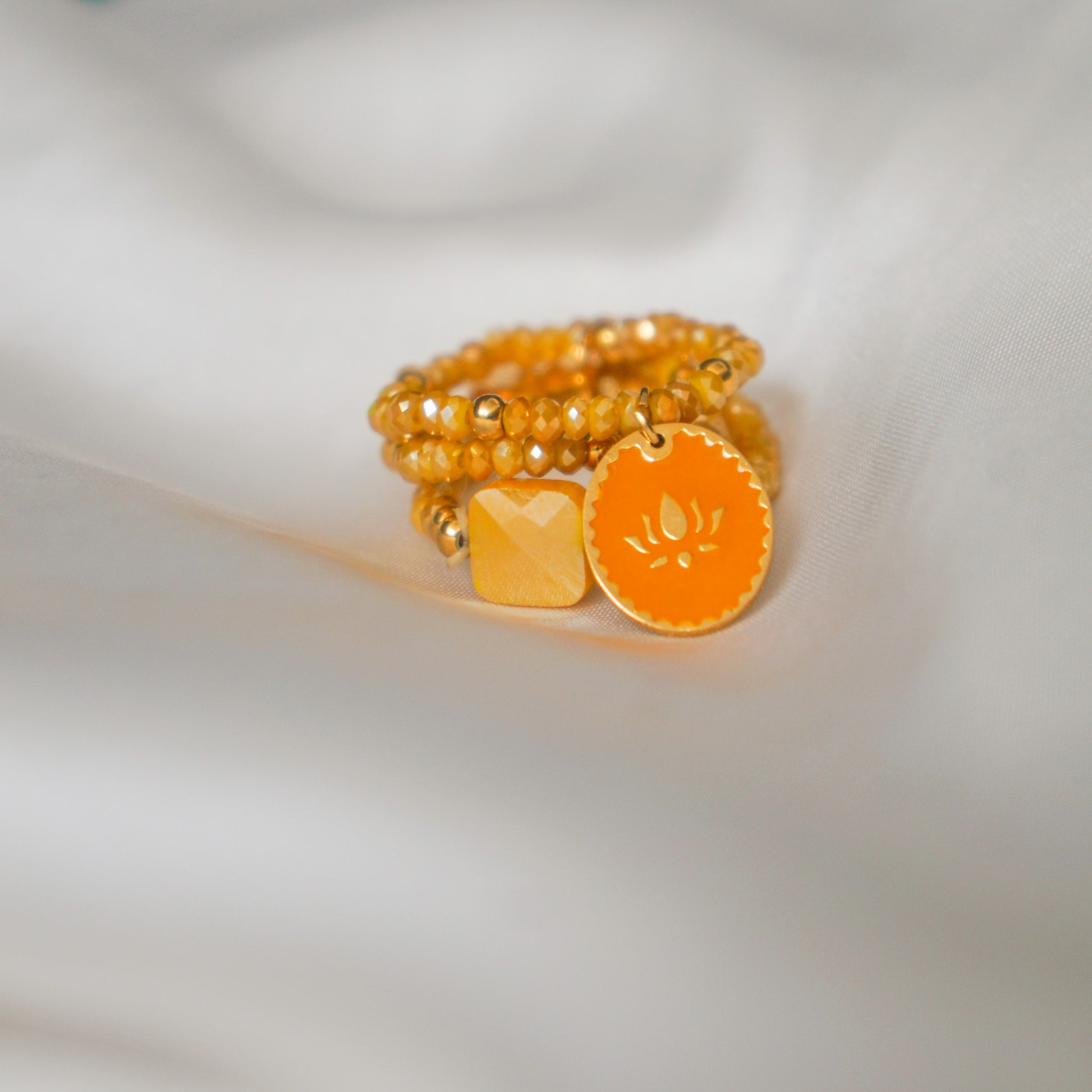 Offrez une touche de luxe et de raffinement avec la Bague Isabella! Ornée d'une combinaison hautement stylisée de perles orangées et dorées, cette bague en acier inoxydable offre un style 3 rangs avec un pendentif fleur de lotus pour une touche féminine et sophistiquée. Ce bijou précieux est parfait pour accompagner des tenues habillées et offrir une élégance exquise.