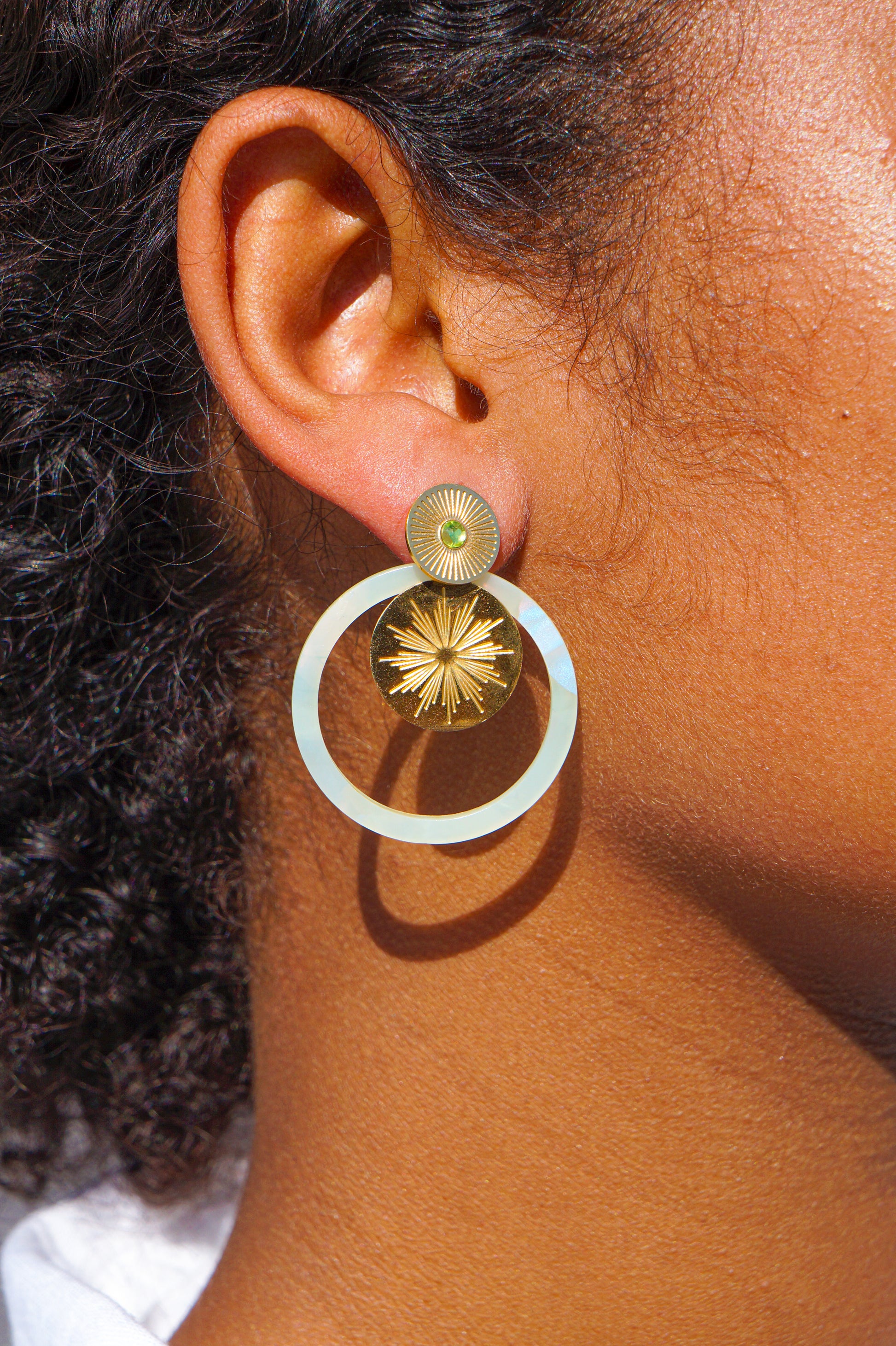Le motif du soleil gravé est le véritable point focal de ces boucles d'oreilles. Le soleil symbolise la vitalité, la lumière et la positivité. Son motif gravé avec précision évoque une sensation de chaleur et de rayonnement. L'encerclement vert qui l'entoure ajoute une dimension naturelle et apaisante, rappelant la fraîcheur de la nature.