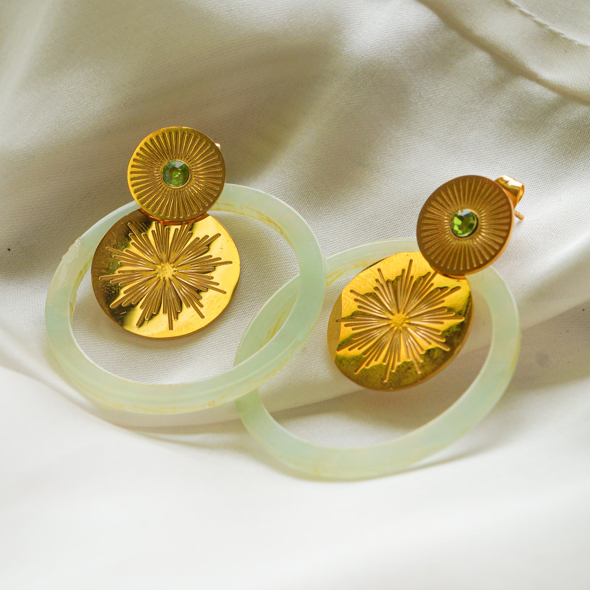 Cette magnifique paire de boucles d'oreilles en acier inoxydable doré est à la fois élégante et envoûtante. Chaque boucle d'oreille est dotée d'une plaque dorée délicate qui met en valeur un motif gravé d'un soleil resplendissant, entouré d'un encerclement vert.