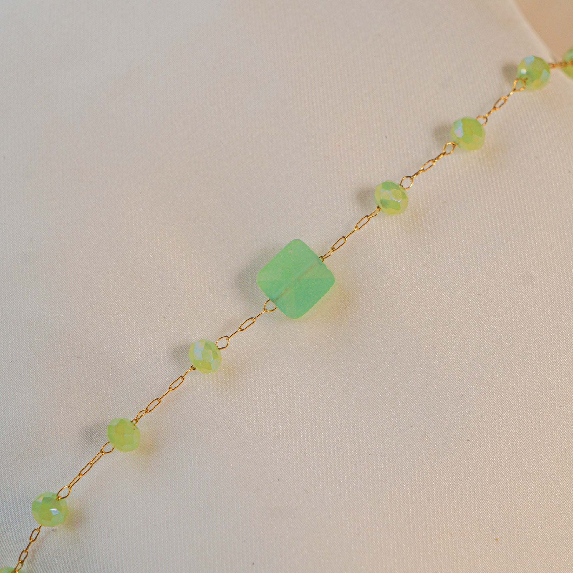 Le bracelet en acier inoxydable doré est un bijou d'une élégance remarquable. Son motif central met en avant une pierre d'imitation carré verte, magnifiquement réalisé avec des petites pierres ronde vertes sur tout le pourtour de la chaine.