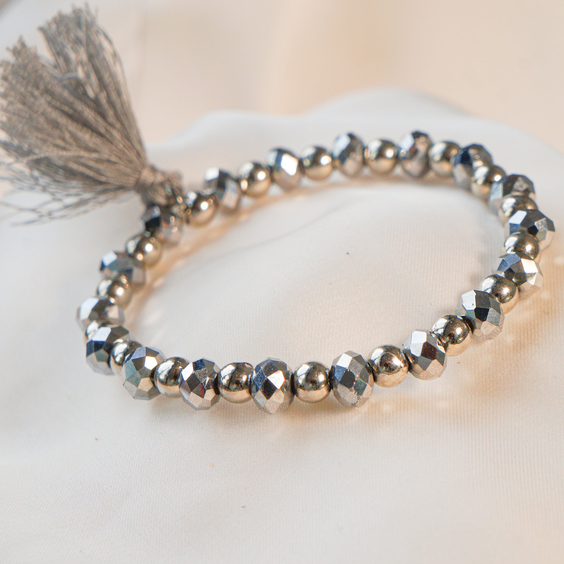 Les perles argentées brillantes sont la caractéristique principale de ce bracelet. Elles sont rondes et présentent une finition argentée étincelante, ajoutant une touche de glamour à votre poignet.