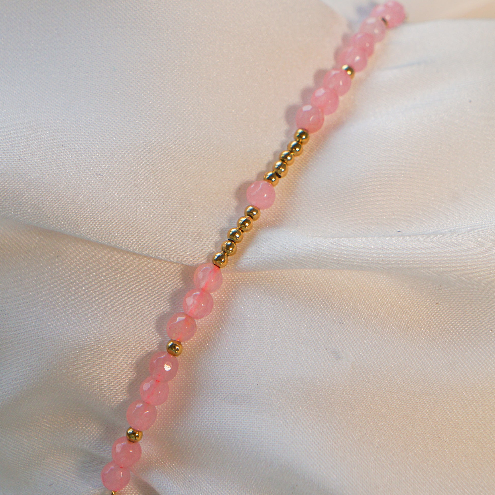 Le bracelet est orné de perles roses et dorées disposées avec soin tout au long de son pourtour. Les perles roses apportent une touche de fraîcheur et de vitalité, tandis que les perles dorées ajoutent une note de sophistication et de glamour. Cette combinaison de couleurs crée un contraste visuel attrayant et met en valeur le design du bracelet.