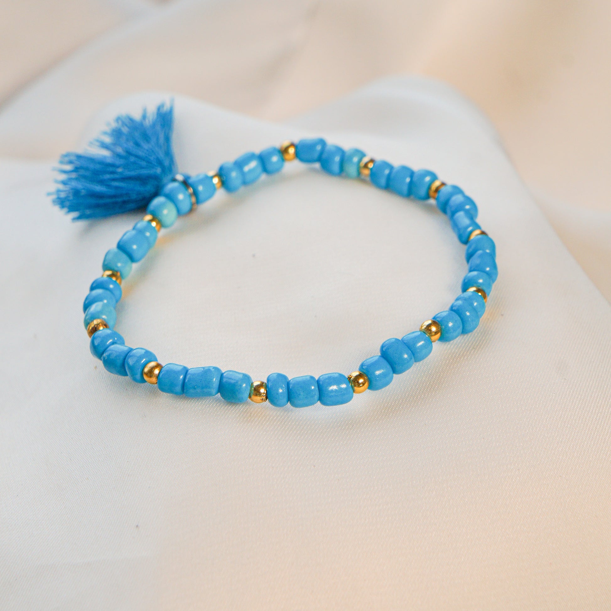 Ce bracelet élastique avec des perles bleues et dorées, accompagné d'un pompon bleu, est idéal pour ajouter une touche de couleur et de vivacité à votre poignet. Que ce soit pour une journée ensoleillée d'été ou pour rehausser une tenue plus habillée, ce bracelet apporte une atmosphère vibrante et joyeuse à votre look.