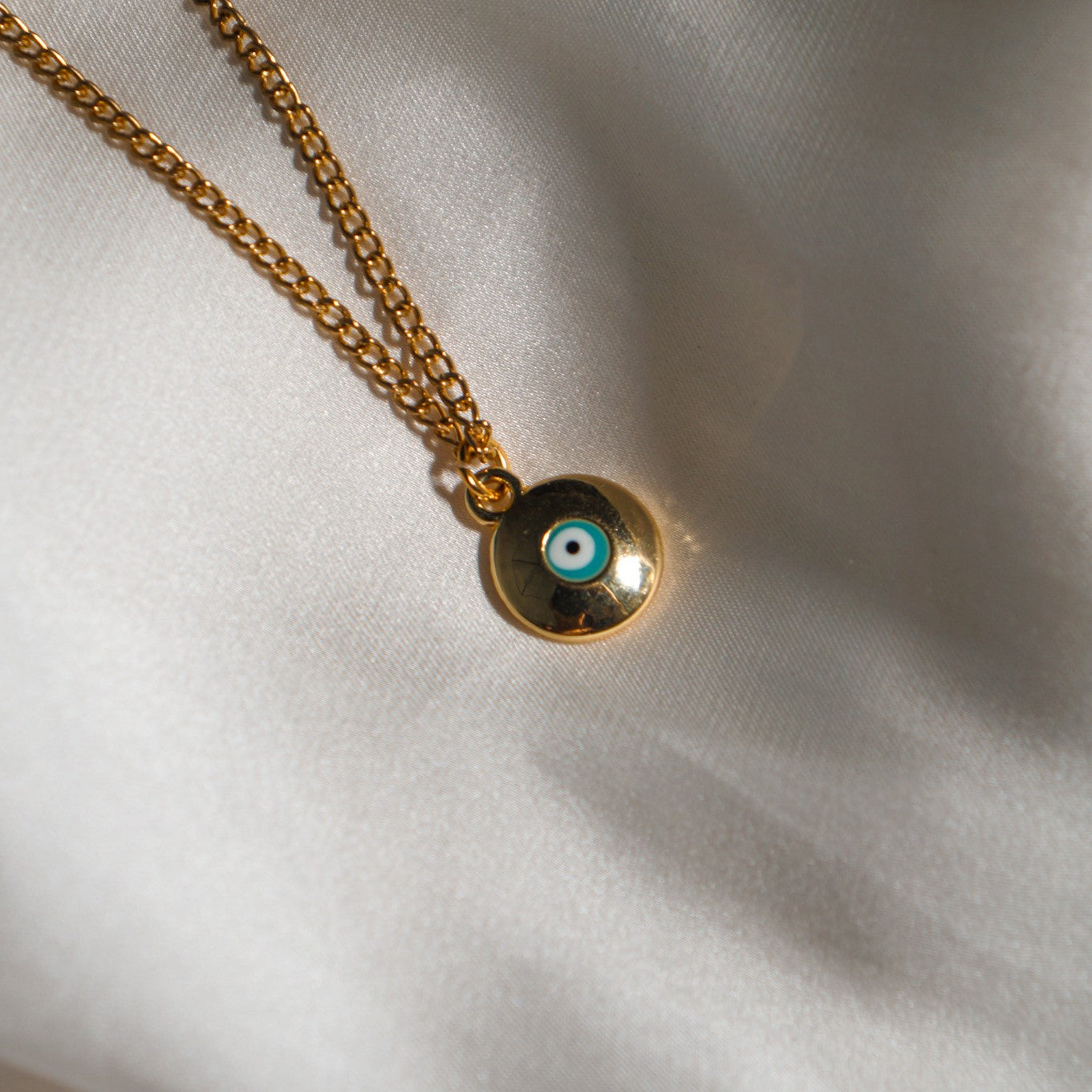 Au centre du pendentif rond, se trouve un œil grec en turquoise. L'œil grec est un symbole traditionnel de protection contre le mauvais œil et est souvent associé à la chance et à la bonne fortune. La couleur turquoise ajoute une touche de fraîcheur et de calme, soulignant la signification protectrice de l'œil.