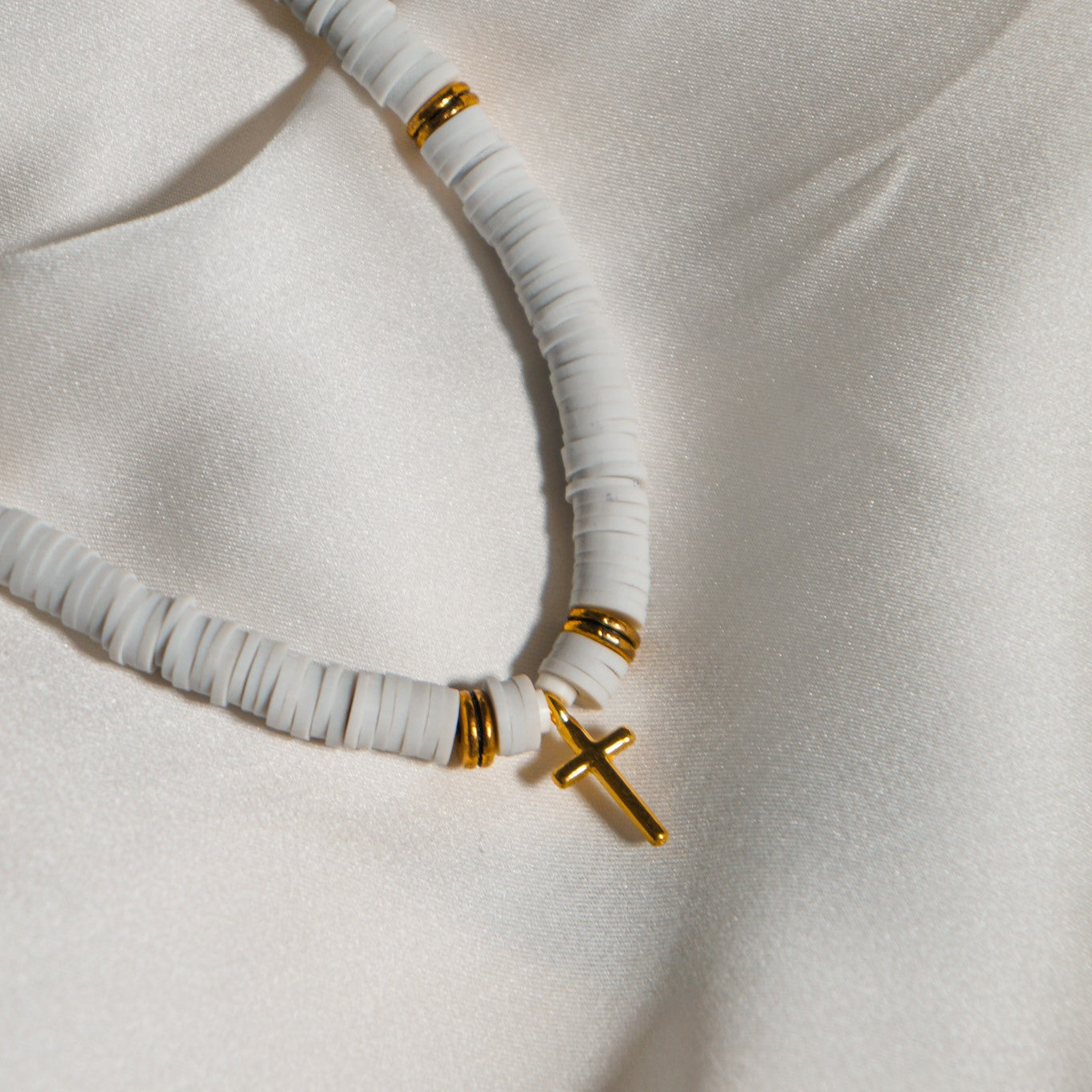 Le pendentif en forme de croix dorée est le point focal de ce collier. La croix est un symbole spirituel universellement reconnu, représentant la foi et la spiritualité. Le fini doré du pendentif ajoute une touche de lumière et de brillance, soulignant son importance symbolique.
