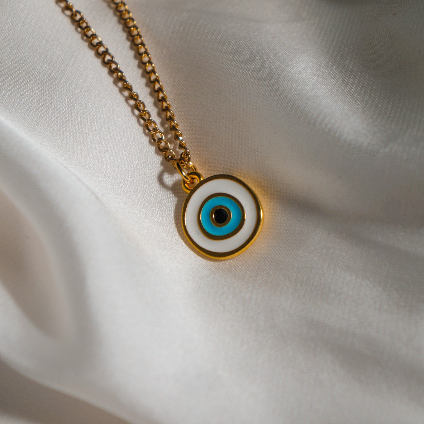 Au centre du pendentif rond, se trouve un œil grec en turquoise. L'œil grec est un symbole traditionnel de protection contre le mauvais œil et est souvent associé à la chance et à la bonne fortune. La couleur turquoise ajoute une touche de fraîcheur et de calme, soulignant la signification protectrice de l'œil.