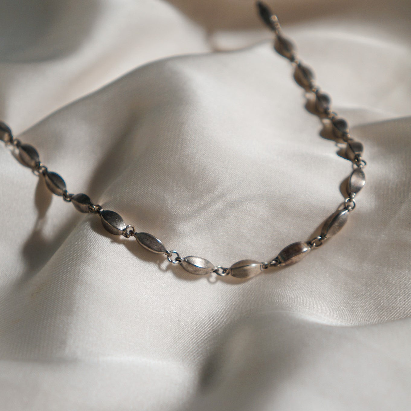 Les maillons de cette chaîne sont conçus pour ressembler à de délicats grains de café, créant un motif texturé et distinctif. Chaque maillon est soigneusement travaillé pour capturer les détails réalistes des grains de café, ajoutant une touche de charme rustique à cette pièce.
