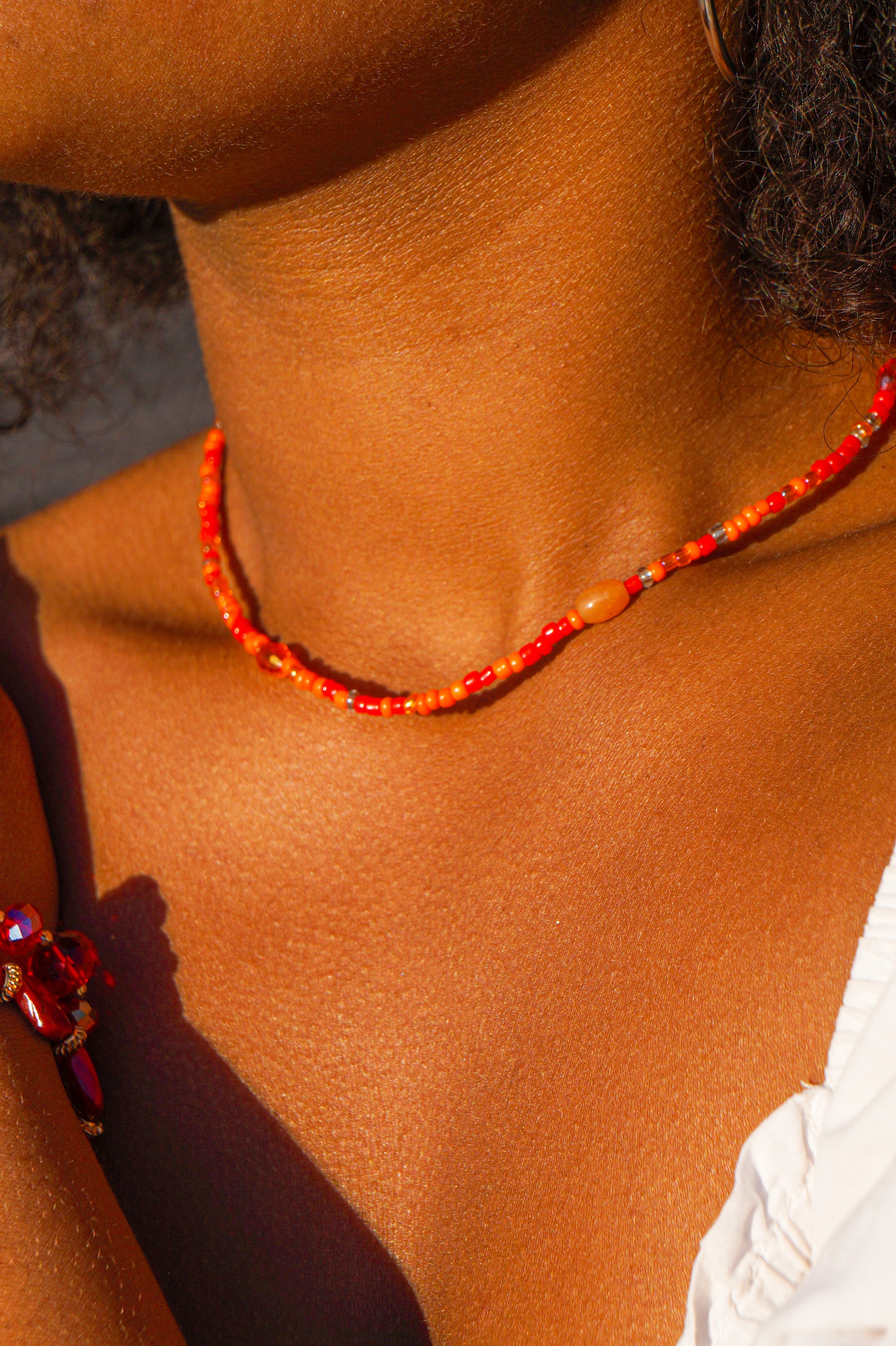 Le collier en question est une pièce unique et remarquable, composée de perles oranges éclatantes. Chaque perle a été soigneusement choisie pour sa couleur vibrante et sa texture lisse, créant ainsi un contraste saisissant avec le reste de la collection.