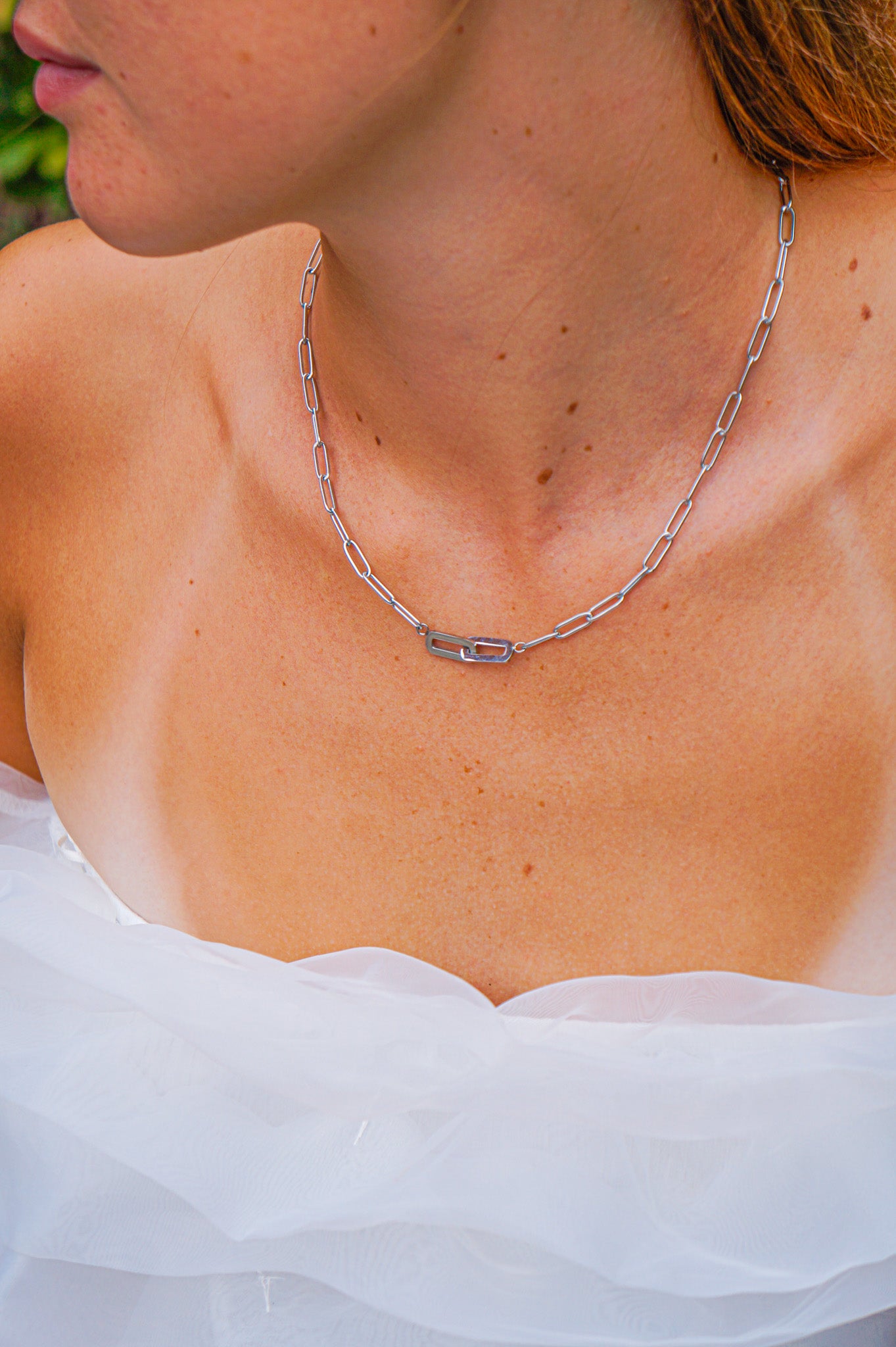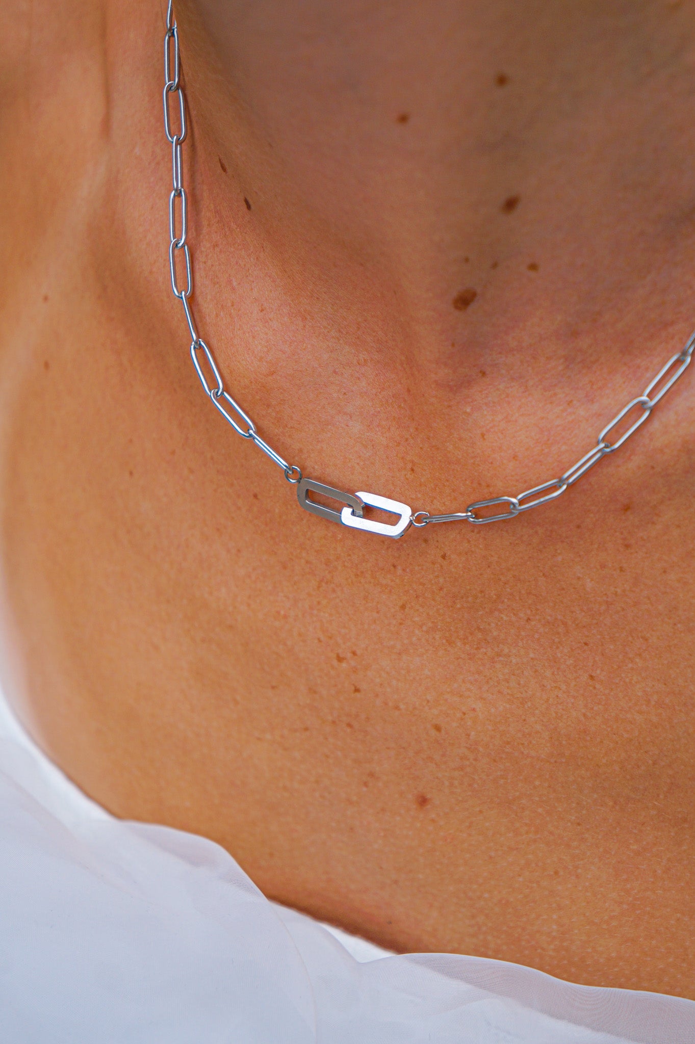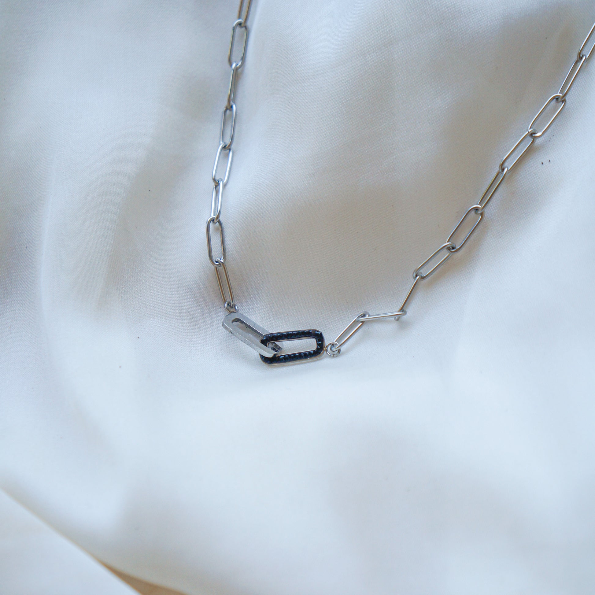 Le collier Roxane est composé d'acier inoxydable argenté et de maillons imposants, soulignant ainsi votre beauté et votre élégance. Attentif à chaque détail, le motif central avec deux rectangles entremêlés et des détails de strass noir contribue à son design exaltant et réversible. Ce joyau de sophistication ravira tous les amateurs de luxe.