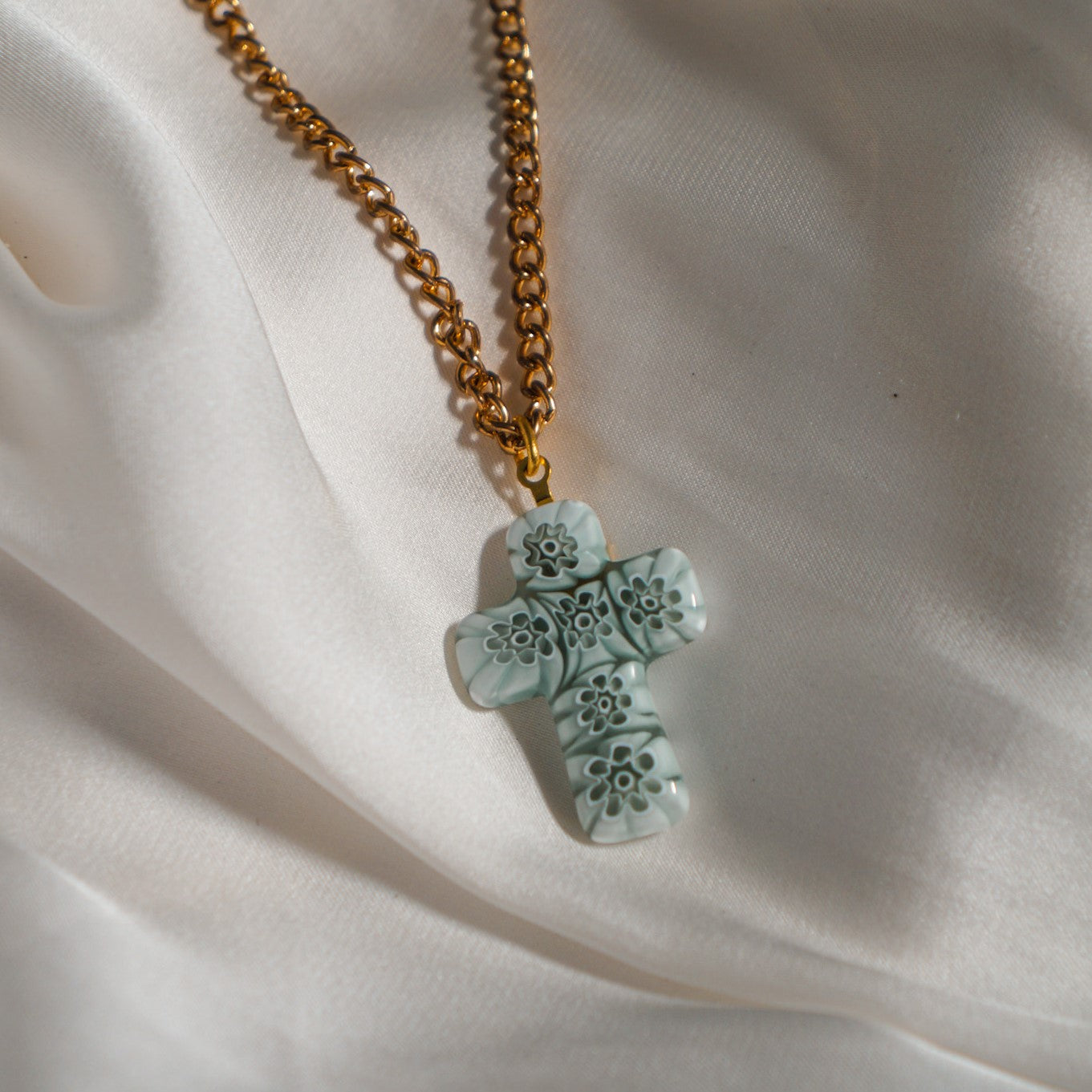 Le pendentif en croix est fabriqué à partir de verre de Murano, célèbre pour son excellence artisanale et ses couleurs vibrantes. La croix en verre de Murano peut présenter des nuances de couleurs riches et des motifs fascinants, résultant d'un processus de fabrication artisanal.