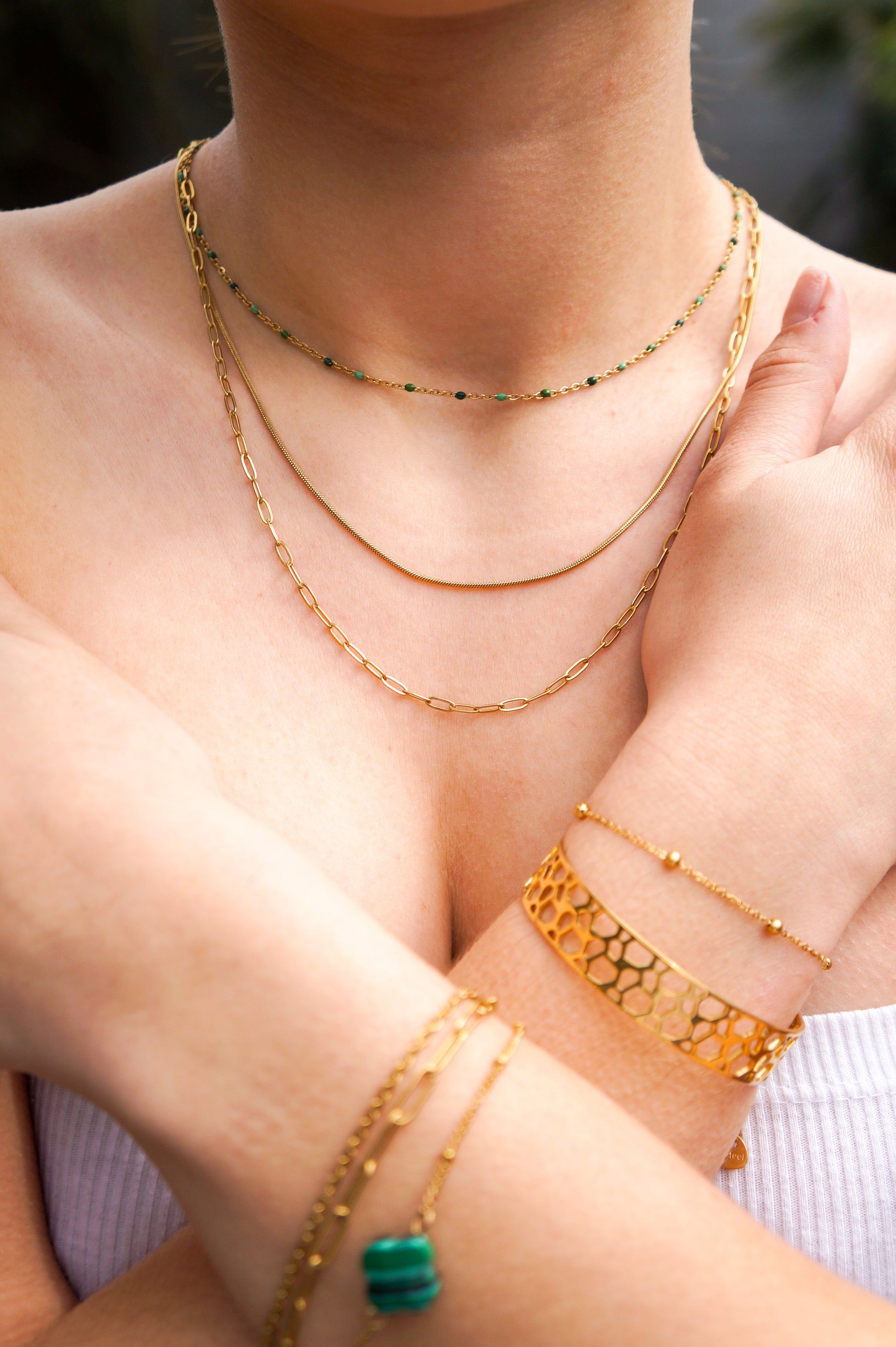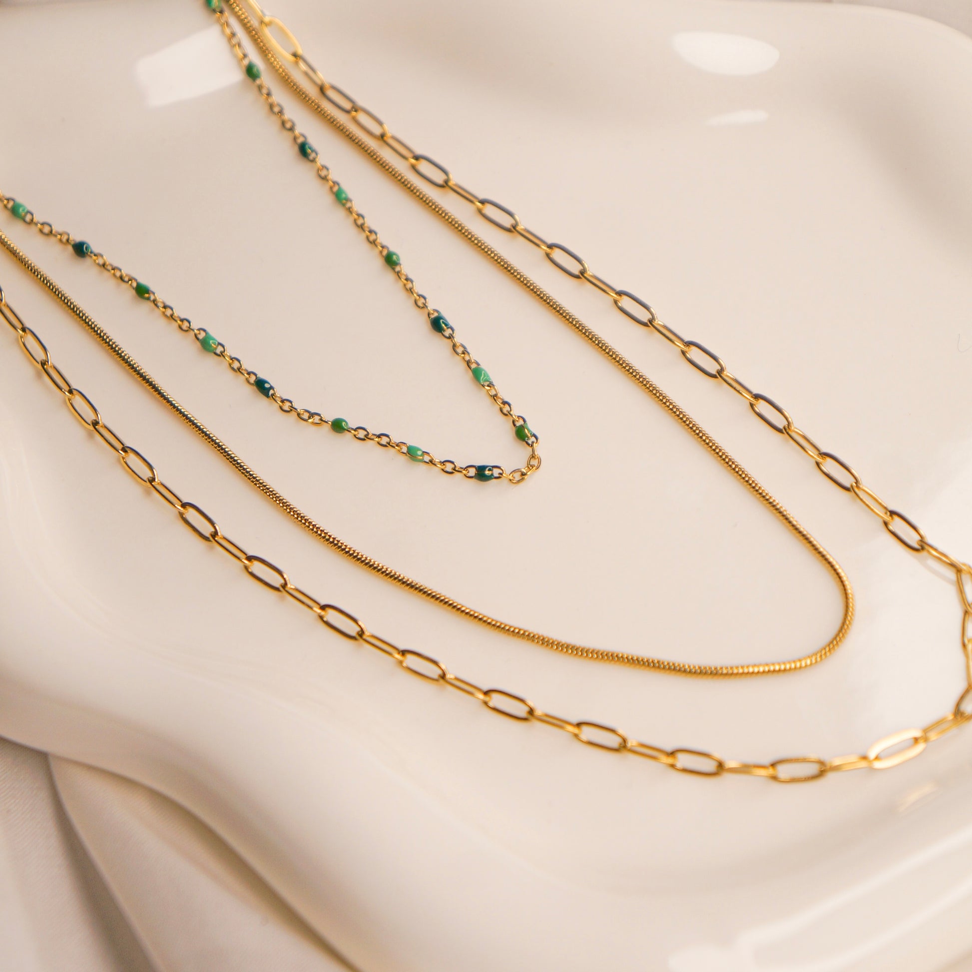 Découvrez notre Collier Eli, un bijou sophistiqué et exclusif qui illumine toute tenue. Avec ses 3 rangs délicats, ses perles vertes lumineuses et ses chaînettes, ce collier apporte une touche de luxe à votre look. Ajoutez-le à votre collection pour un style unique et élégant.