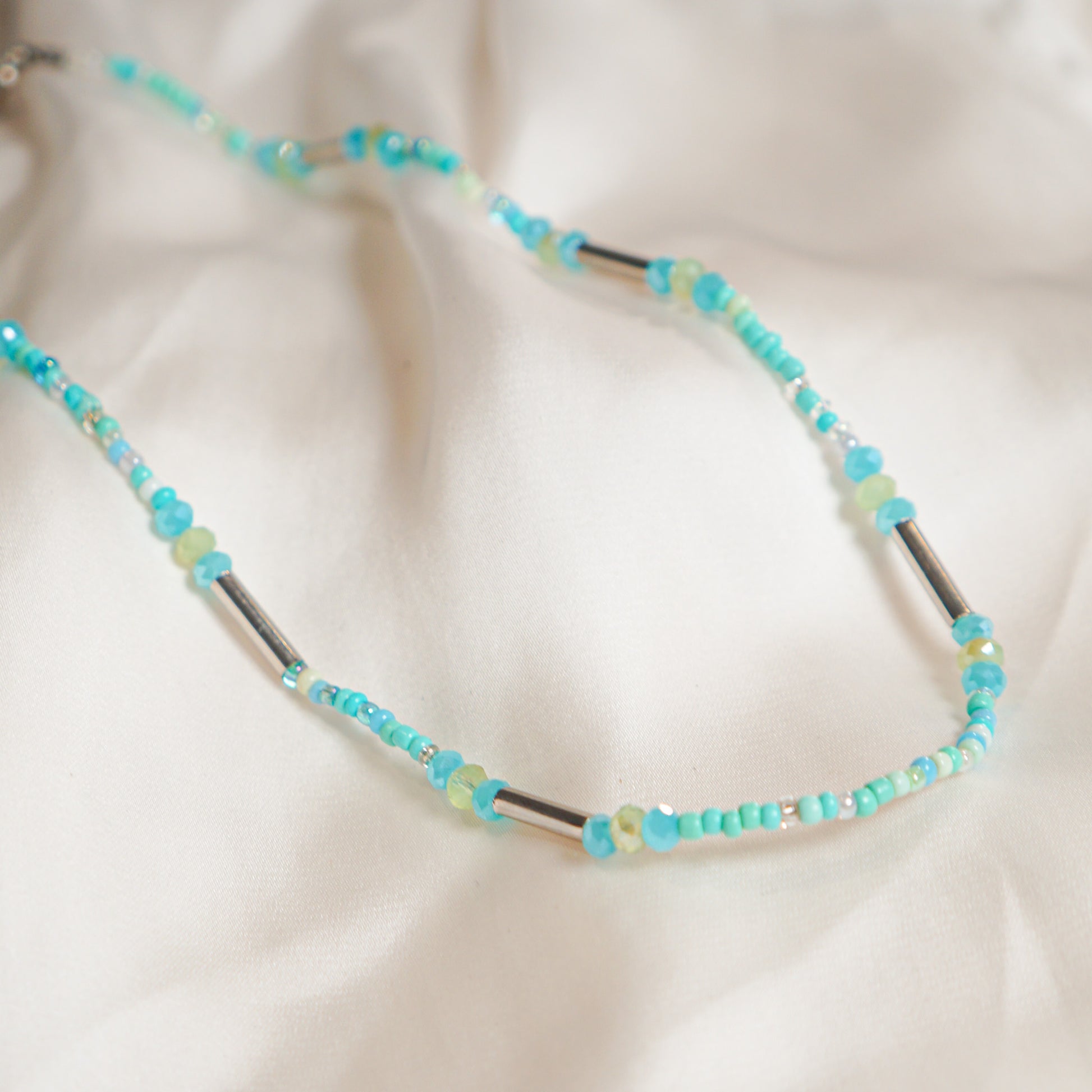 Ce collier est un véritable bijou de l'été ! Avec sa multitude de perles dans les tons de bleus turquoises parfait pour la saison estivale à venir, il ne manquera pas de vous faire remarquer et de vous donner un air frais et estival. Les perles sont magnifiquement assorties les unes aux autres pour créer une harmonie parfaite. Ce collier est issu d'une collection axée sur la protection de l'environnement et la durabilité en encourageant la récupération de bijoux avec de petites imperfections remis à neuf plutôt que de céder à la fast fashion. Portez-le avec fierté, sachant que vous contribuez à la préservation de la planète tout en étant à la pointe de la mode.