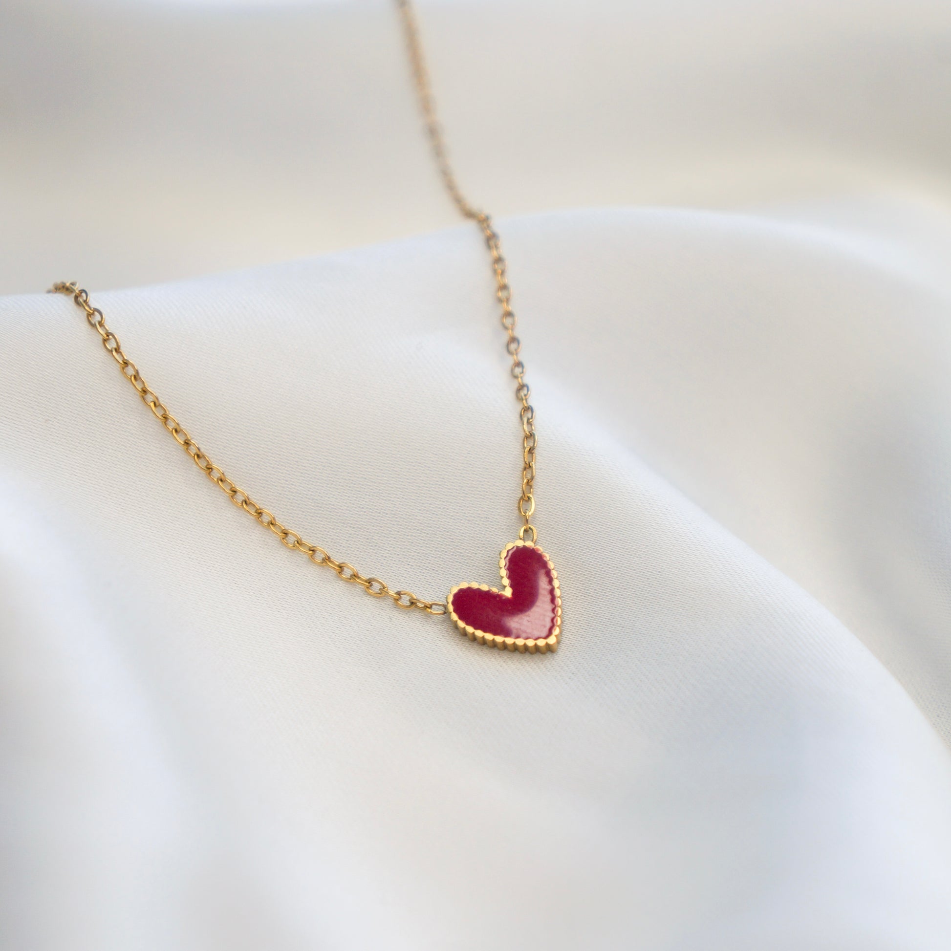 Le collier Ophélia est un joyau à la pointe de la mode. Recouvert d'acier inoxydable plaqué doré, ce ras de cou chic est orné d'un petit cœur rouge en pendentif. Délicat et sophistiqué, ce bijou est un choix élégant qui souligne votre beauté.