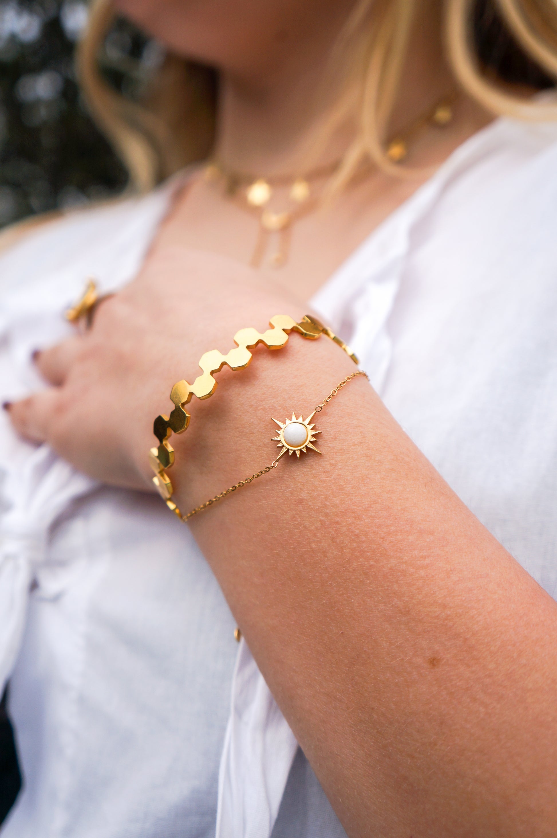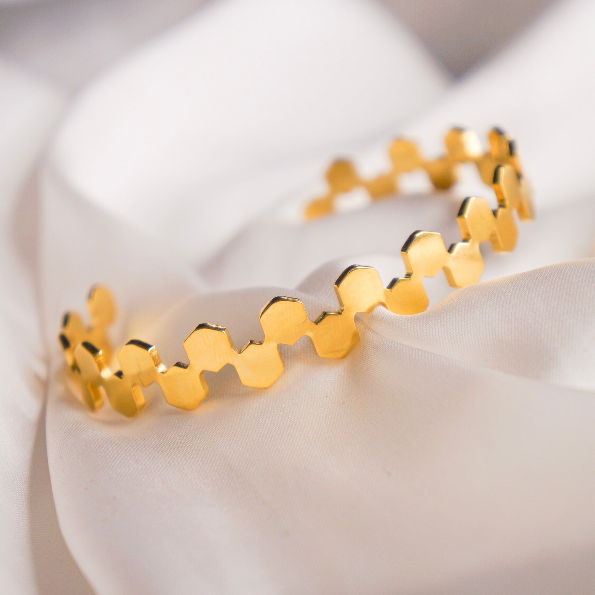 Le jonc Bee est l'accessoire parfait pour les femmes élégantes et sophistiquées. Fabriqué en acier inoxydable doré, ce jonc réglable en forme de ruche allie style et qualité. Ajoutez une touche de luxe à votre tenue avec ce bijou exclusif inspiré de la nature.