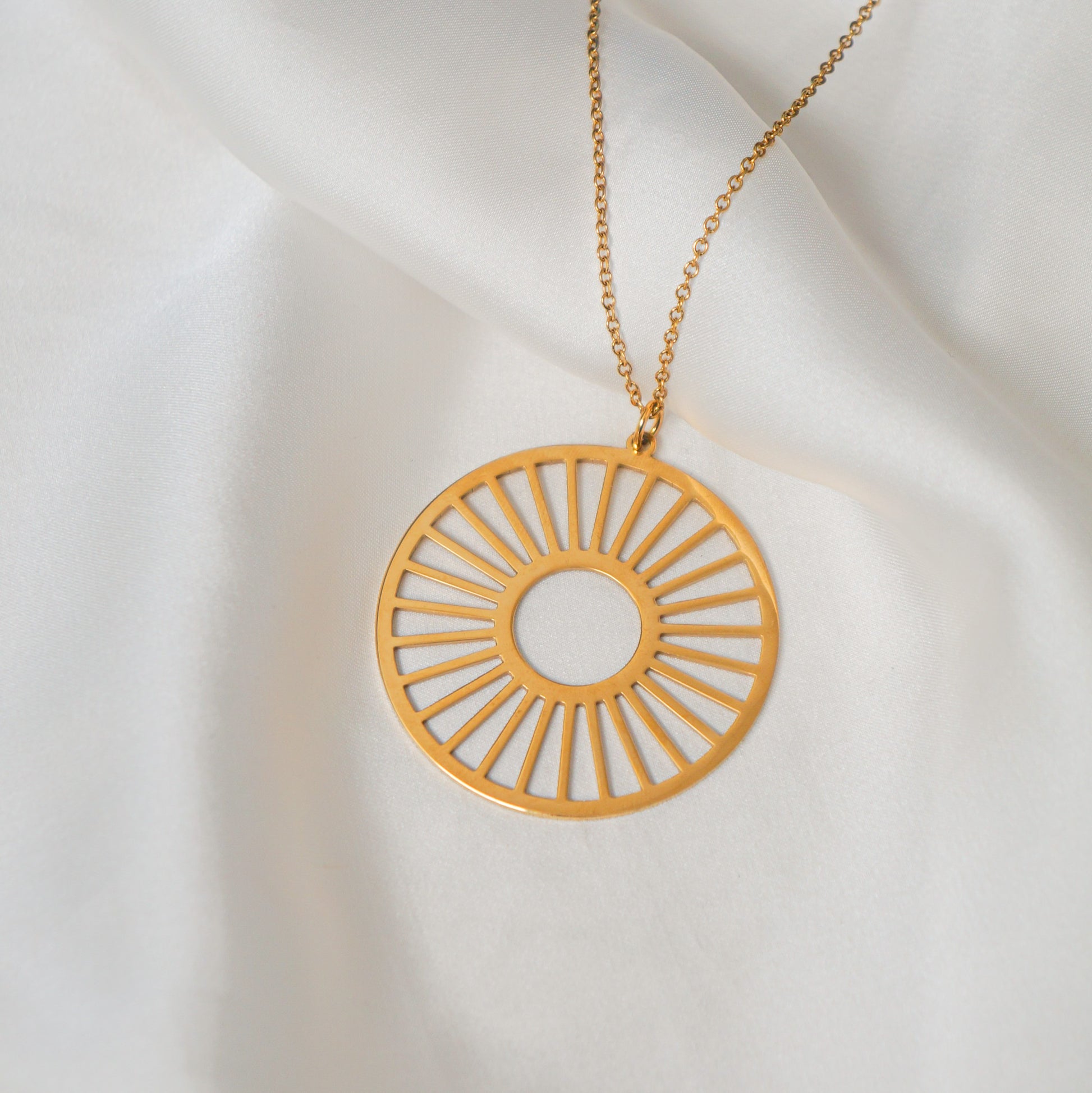 Achetez le sautoir Bianca pour vous offrir une combinaison luxueuse de sophistication et de glamour. Conçu en acier inoxydable doré, notre sautoir se distingue par une roue en pendentif dont la forme unique offre au porteur une aura élégante et raffinée. Une conception luxueuse qui incarne une sophistication.