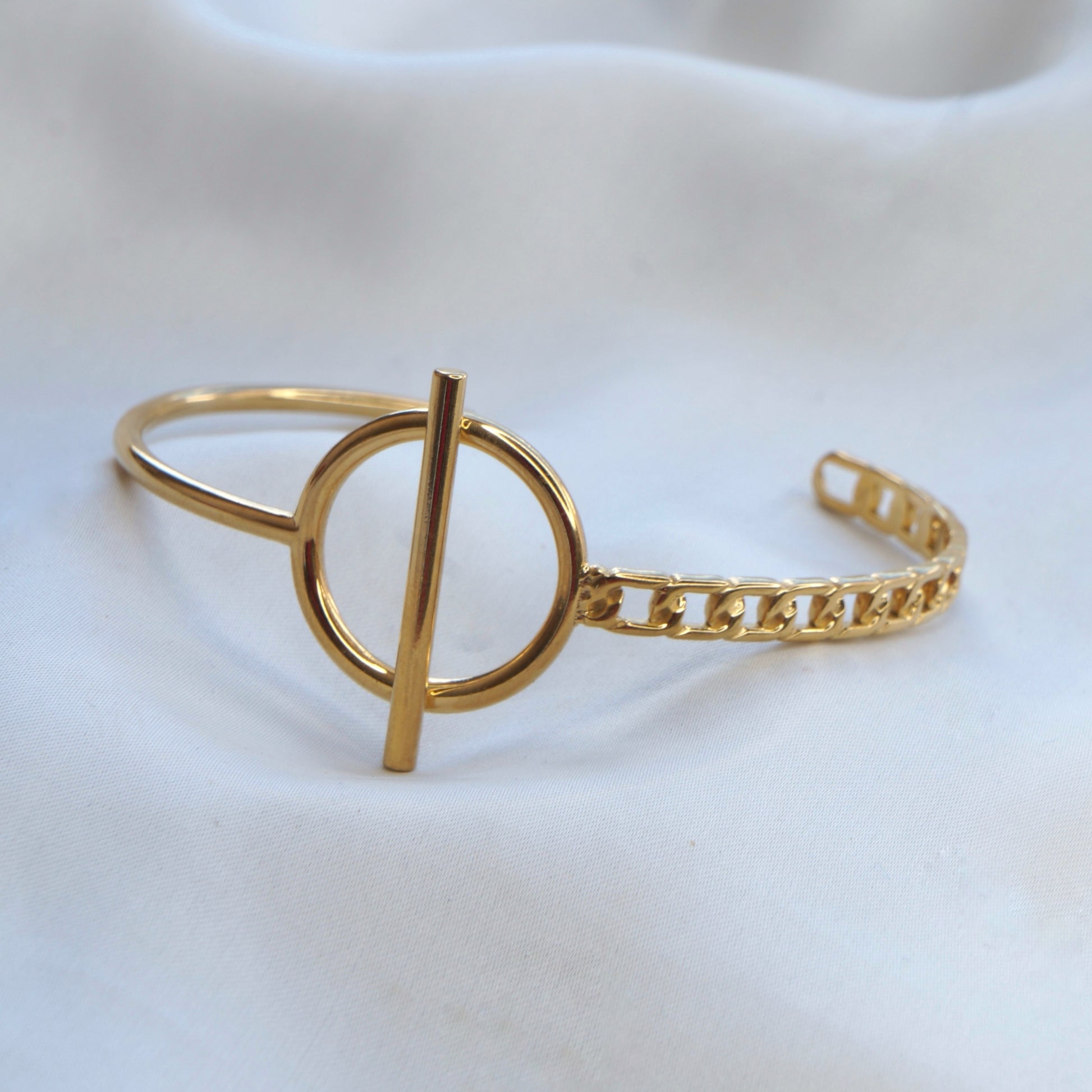 Le jonc Euphrosyne en acier inoxydable doré est un bijou de luxe qui ajoute une touche sophistiquée à votre tenue. Avec son motif central en forme de rond barré, il est réglable pour un ajustement parfait. Faites une déclaration de style avec ce bijou exclusif.