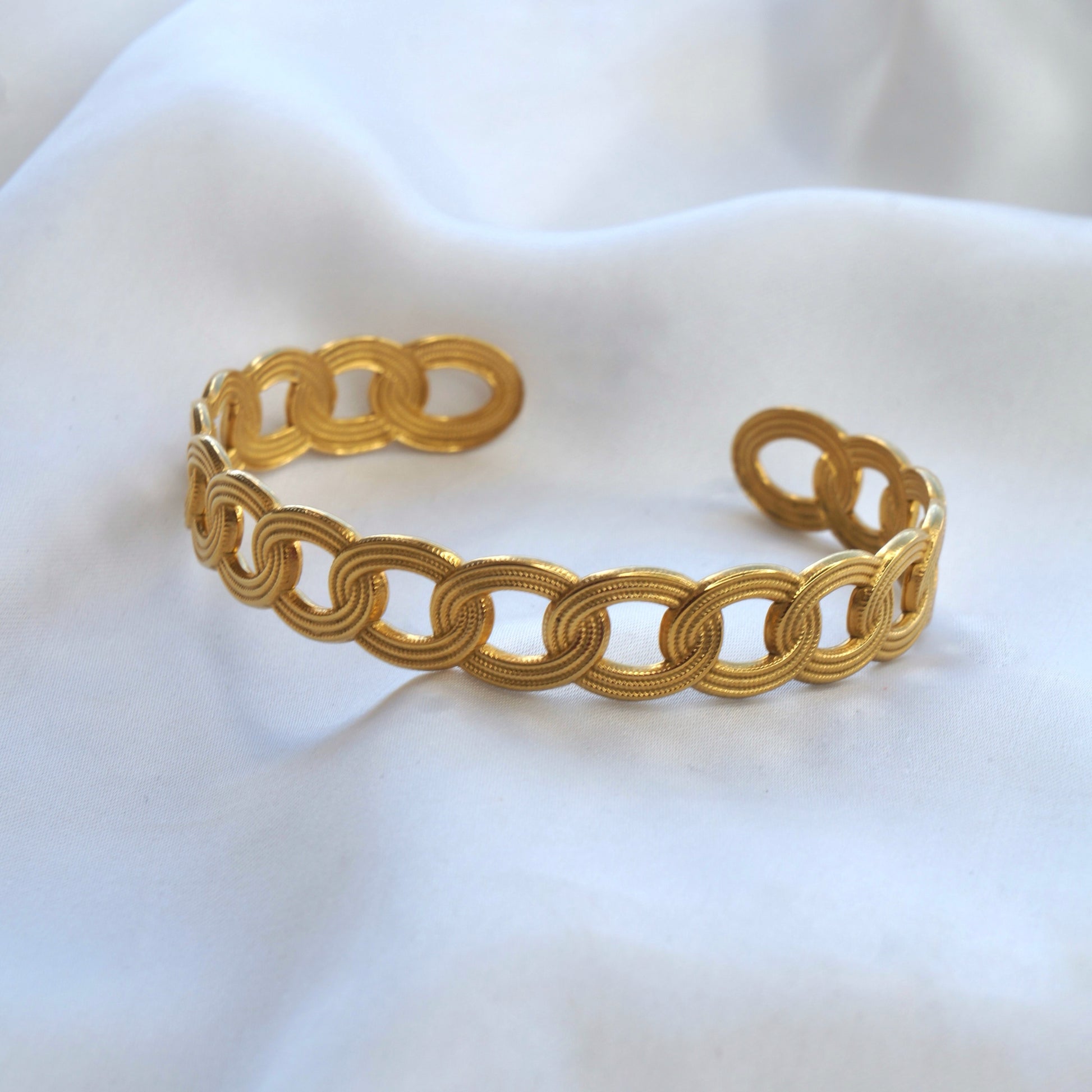 Ce jonc en acier inoxydable doré avec maille est l'accessoire parfait pour compléter votre tenue avec élégance et raffinement. Fabriqué avec des matériaux de haute qualité, ce jonc apportera une touche de luxe à votre look. Sa maille délicate évoque l'élégance et la sophistication de la haute couture.