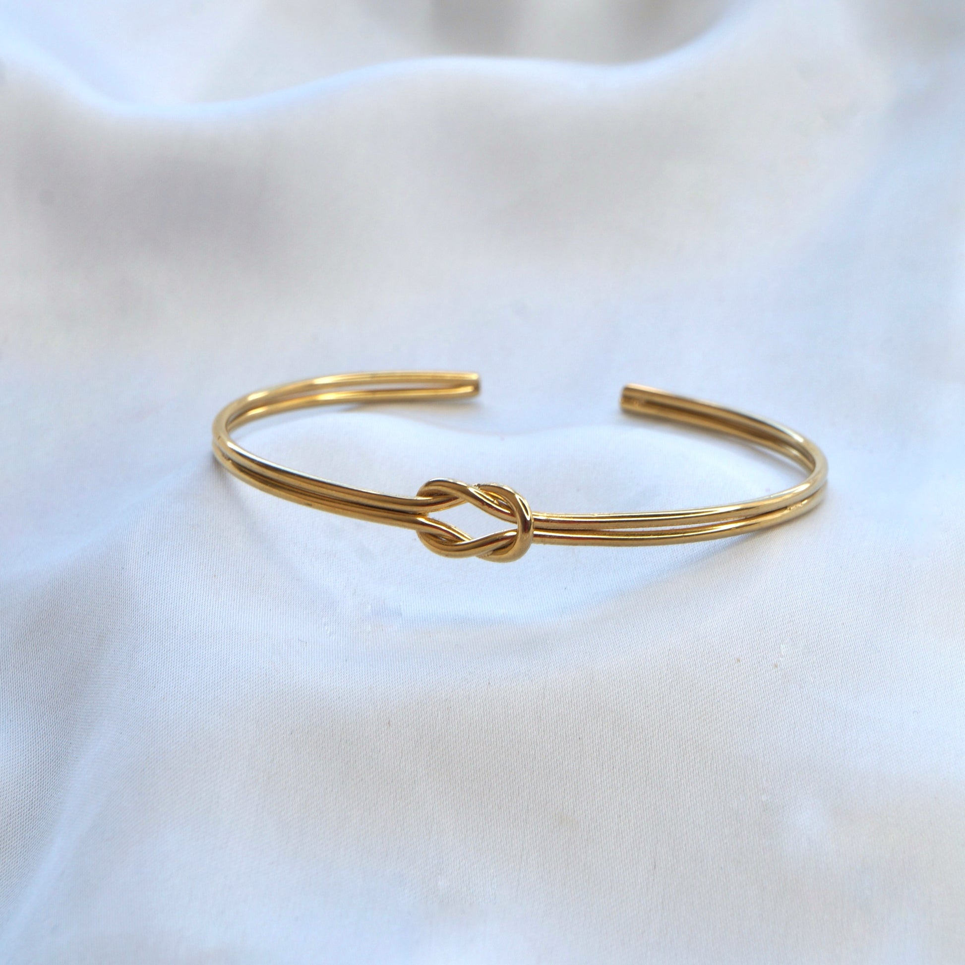 Rehaussez votre élégance avec notre jonc Nausica en acier inoxydable doré. Son motif délicat de noeud ajoute une touche de sophistication à votre tenue. Fabriqué avec des matériaux de haute qualité, ce jonc fin est le choix parfait pour affirmer votre style exclusif.