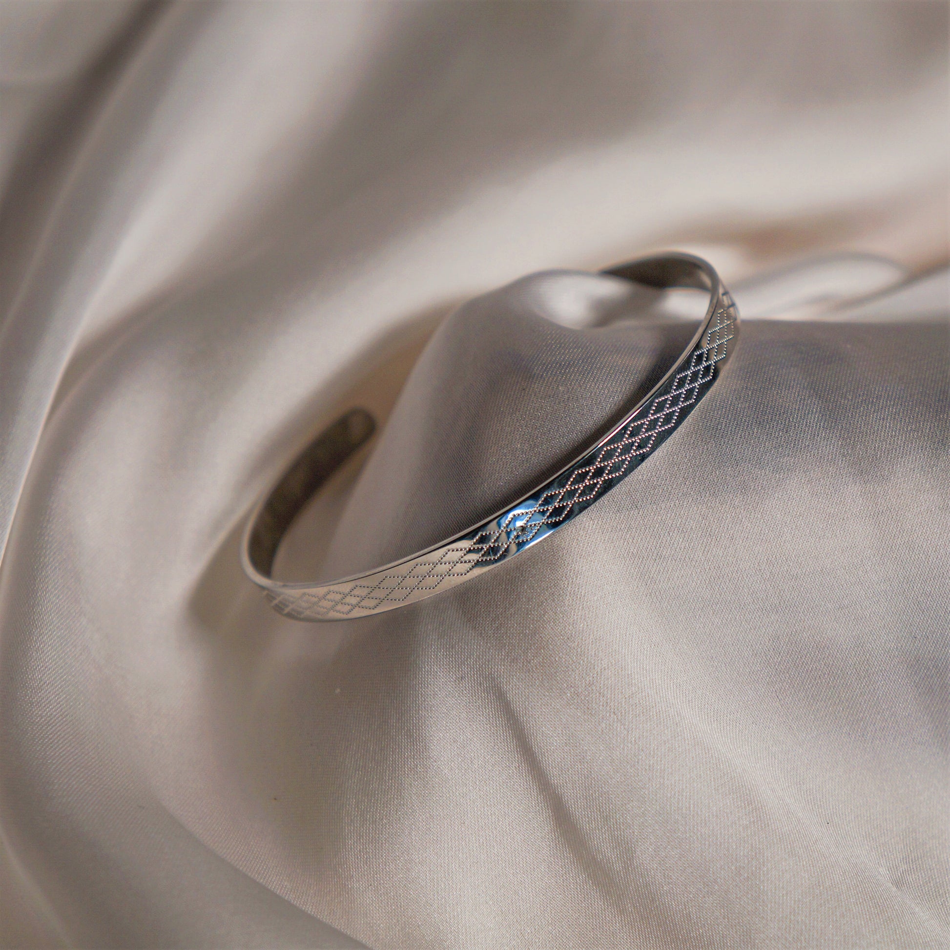 En résumé, un jonc réglable en acier inoxydable argenté avec un motif géométrique d'inspiration ethnique est un bijou original, élégant, durable, confortable et hypoallergénique. Avec son motif ethnique sophistiqué et son design épuré, il conviendra à tous les styles vestimentaires et toutes les occasions.
