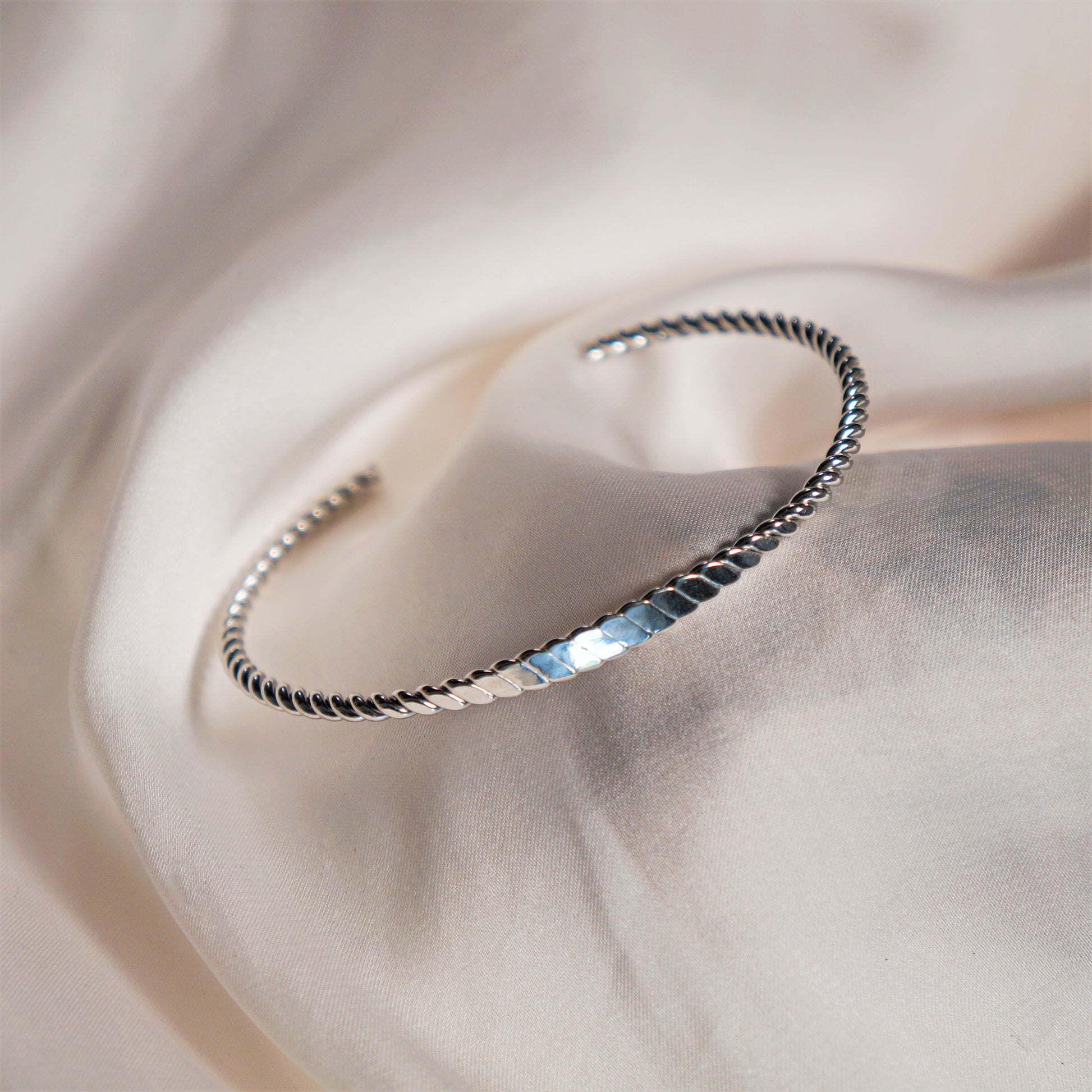 Le jonc en acier inoxydable argenté au motif tissé réglable est également très polyvalent. Il peut être porté seul pour un look minimaliste et élégant, ou associé à d'autres bracelets pour créer une allure plus audacieuse et personnalisée.
