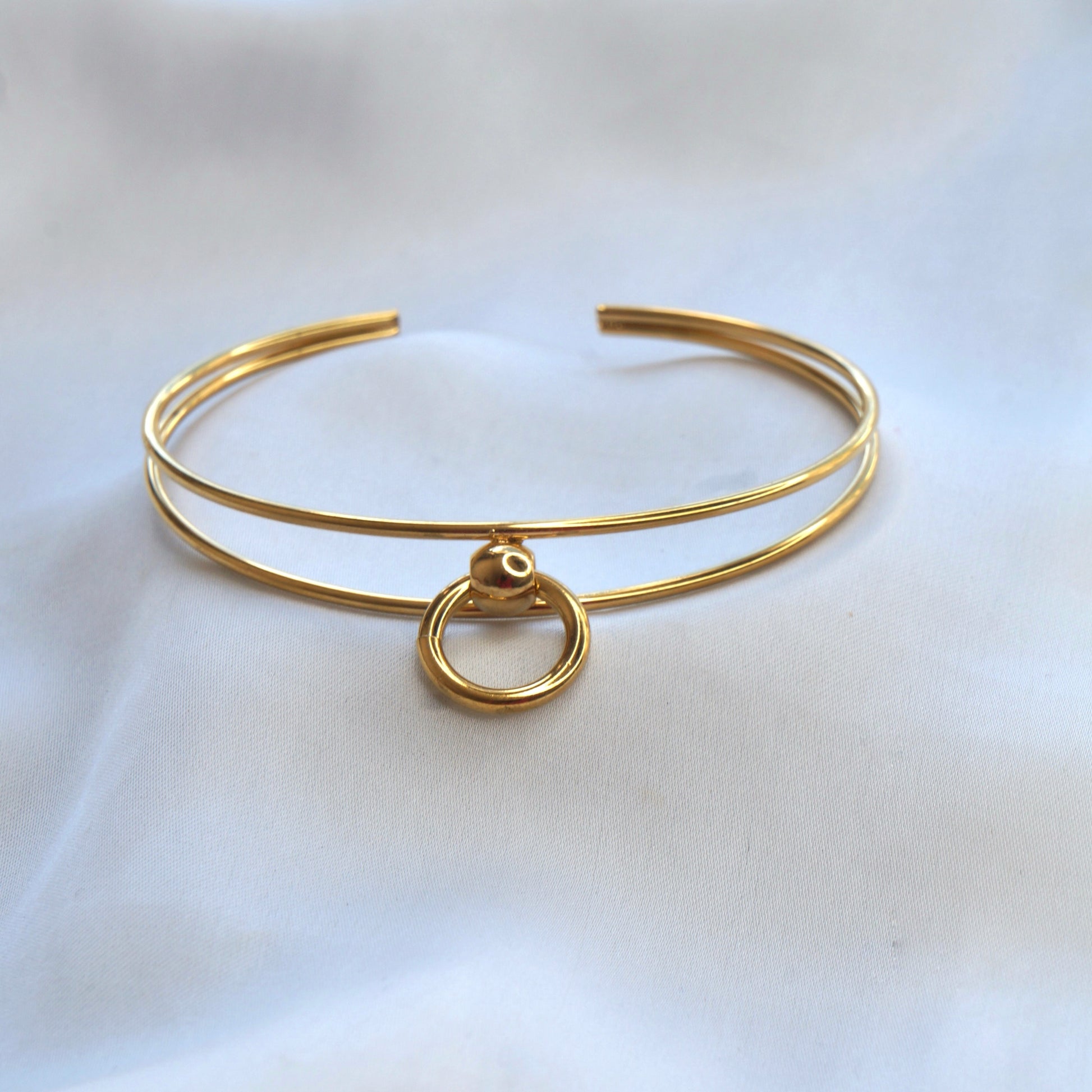 Elevatez votre style avec le jonc Thalia en acier inoxydable doré. La pampille mobile apporte une touche de sophistication et de mouvement à votre tenue. Parfait pour les amoureux de la mode qui cherchent à se démarquer avec élégance.