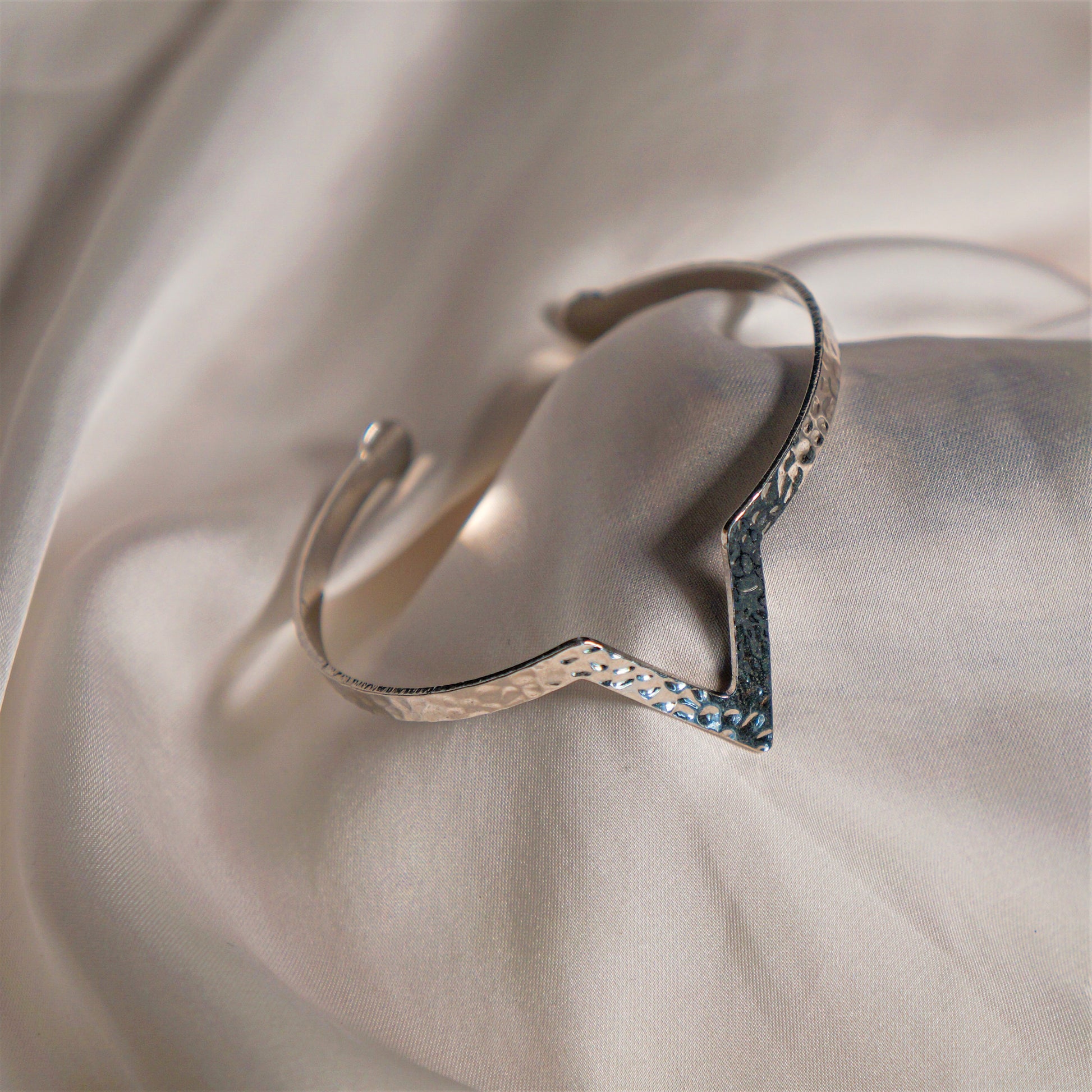 Le jonc en acier inoxydable argenté au motif martelé avec un V en guise de symbole central est également très polyvalent. Il peut être porté seul pour un look minimaliste et élégant, ou associé à d'autres bracelets pour créer une allure plus audacieuse et personnalisée.